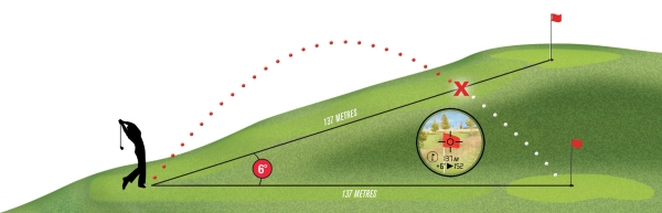 - Entfernungsanzeige in Yards und Metern, 275 m bis zur Fahne, 915 m max