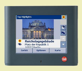 Einfache OrientierungMit der neuesten Software Generation Falk Navigator 5 ist die Kartendarstellung in 2D oder 3D noch genauer und übersichtlicher geworden. Gebäudeumrisse, Maßstab und Kompass vereinfachen die Orientierung. Eine klare Nachtansicht und erweiterte Ansagen zu Autobahn- und Bundesstraßenbezeichnungen ermöglichen eine noch präzisere Zielführung; Mautstraßen können für die Routenberechnung ausgeschaltet werden. |