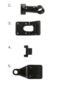 | 1. RIDER-Halterung 2. Lenkstangen-Halterung 3. Selbstklebende Halterung 4. Lenkstangen-Adapter 5. Spiegelhalterung Garantiebeschreibung |