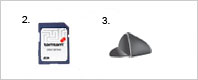 | 2. SD-Karte. Enthält Kartendaten. 3. Tragetasche. Zur Aufbewahrung Ihres TomTom GO außerhalb Ihres Fahrzeuges. |