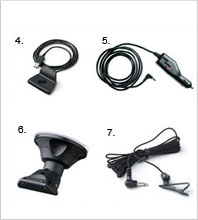 | 4. PC-Dockingstation. Für die einfache Verbindung Ihres GO mit Ihrem PC oder Mac und zum Aufladen Ihres GO zu Hause oder in Ihrem Hotel. Besteht aus Dockingstation, USB-Kabel und stationärem Ladegerät mit verschiedenen internationalen Anschlussadaptern für den weltweiten Einsatz (achten Sie bei Verwendung eines Adapters auf ausreichende Kühlung, indem Sie den Adapter an einem gut belüfteten Ort aufstellen). 5. Autoladegerät. 12-24V Zigarettenanzünderadapter, der auch in LKWs verwendet werden kann. So können Sie Ihren GO unterwegs problemlos aufladen. 6. Windscreen dock. Zur Befestigung Ihres TomTom an der Windschutzscheibe. 7. External microphone. Zur Optimierung der Sprachübertragung bei Nutzung Ihres GO zum Freisprechen. |