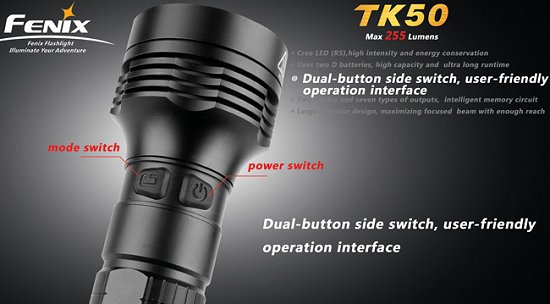 Sie haben nun folgende Möglichkeiten:Die Fenix TK50 ist einen moderne LED Lampe im Design einer guten alten Taschenlampe. Während die Bedienung mit den beiden Drucktastern für das Ein- und Ausschalten und dem getrennten Schalter für die 4 Helligkeitsstufen von der Fenix TK45 übernommen wurde nutzt Fenix in der Fenix TK50 LED Taschenlampe erstmals die großen D / Mono Zellen (Alkaline oder NiMH). Zwei hochwertige Duracell Plus Batterien sind im Lieferumfang enthalten.