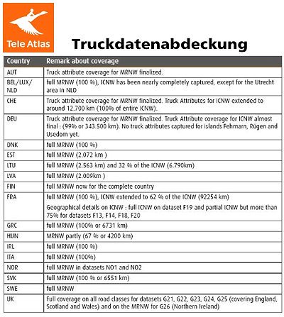 Dennoch biete die Truck Navigation eine extreme Hilfe, denn in der Regel stimmen die Daten. Truckdaten stehen für Deutschland, Östereich, Schweiz, Belgien, Tschechien, Dänemark, Frankreich, Italien, Luxenburg, Holland, Irland, England und Schweden zur Verfügung.