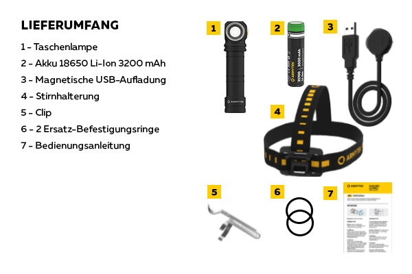 - Laufzeit in niedrigster Leuchtstufe: 3 h (160 lm after 7 min)