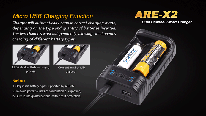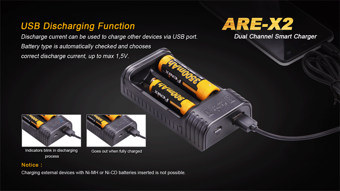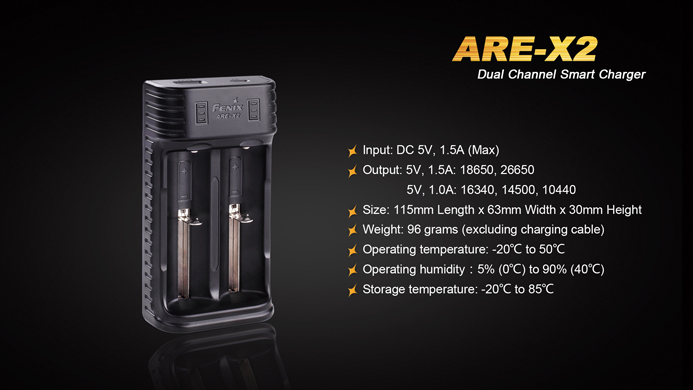 Sie haben nun folgende Möglichkeiten:Der Fenix ARE-X ist ein Zweischacht-Ladegerät für 10440, 14500, 18650, 26650 LiIon Akku und gleichzeitig eine Power Bank mit wechsel Akku. Mit dem Fenix ARE-X2 Ladegerät können Sie Ihre 10440, 14500, 18650, 26650 LiIon Akku LiIon Akkus problemlos wieder aufladen. Mit einem geladene LiIon Akku (Akku nicht im Lieferumfang) können Sie dank der USB-Buchse den Fenix ARE-X2 auch dazu benutzen um andere Geräte aufzuladen. Der Fenix ARE-X2 für Ihr Smartphone/ GPS/ Lampe/ Actioncam bietet eine Ausgangsleitung von bis zu 1500mA. Durch die LED-Ladestatusanzeige wissen Sie immer wie viel Energie Sie noch zur Verfügung haben.