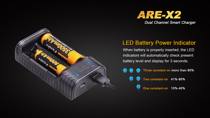 Fenix ARE-X2 Zweischacht-Ladegerät für NiMH und NiCd Akkus: AA, AAA LiIon Akku: 10440, 14500, 18650, 26650