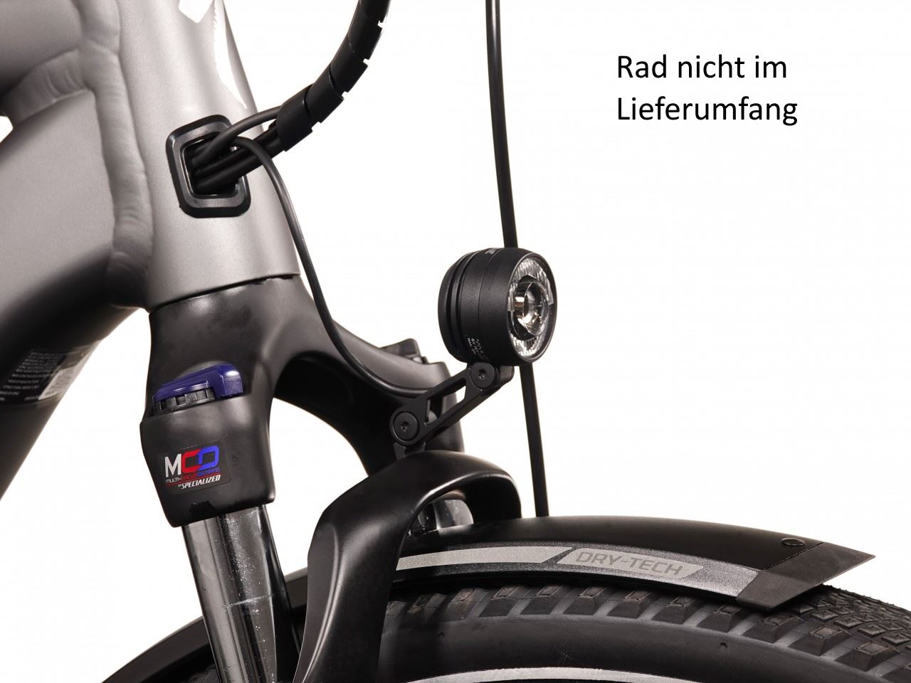 Vor allem für City-Pedelecs und E-Trekking Räder bietet sich die Montage direkt an der Gabelbrücke an. Die Classic-Mount Variante der Lupine SL Nano Classic wird knapp oberhalb des Schutzbleches montiert und schafft somit Platz für einen Bikecomputer, das Handy oder einen Einkaufskorb am Lenker.