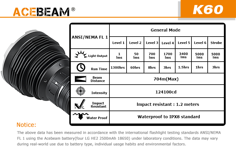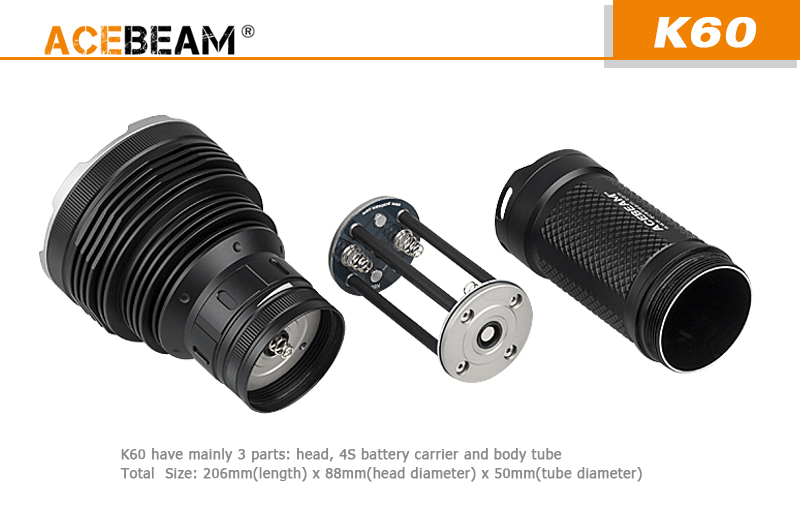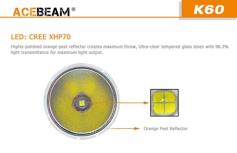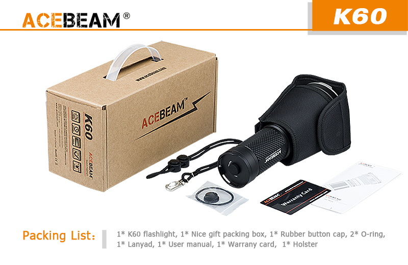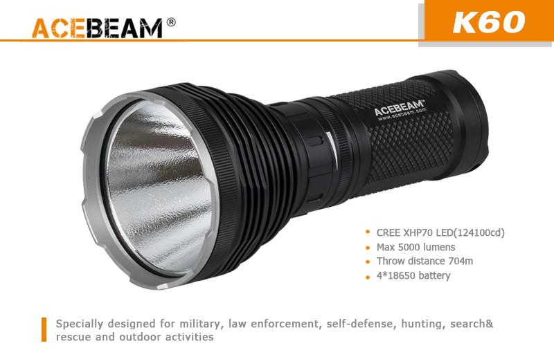 Sie haben nun folgende Möglichkeiten:Die Acebeam K60 LED Taschenlampe ist Suchscheinwerfer und hat mit der CREE XHP70 LED eine Leuchtstärke 5000 Lumen. Der extreme helle und fokussierte Lichtstrahl der Acebeam K60, mit einer Leuchtweite von bis zu 704 Meter, ist ideal geeignet für Such.- und Rettungseinsätze. Die Acebeam K60 LED Taschenlampe hat einen Endkappenschalter zum Ein- und Ausschalten und einem Drehring zur Moduswahl. Die Stromversorgung erfolgt über vier wiederaufladbare 18650 Akkus. Das Gehäuse der Acebeam K60 besteht aus HAIII anodisierten Luftfahrt-Aluminium und ist schlagbeständig und wasserdicht. Diese Version der Acebeam K60 wird OHNE Batterien / Akkus ausgeliefert.