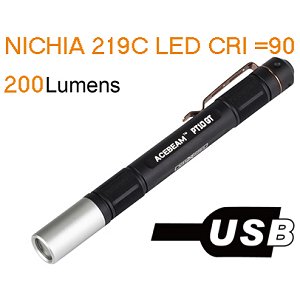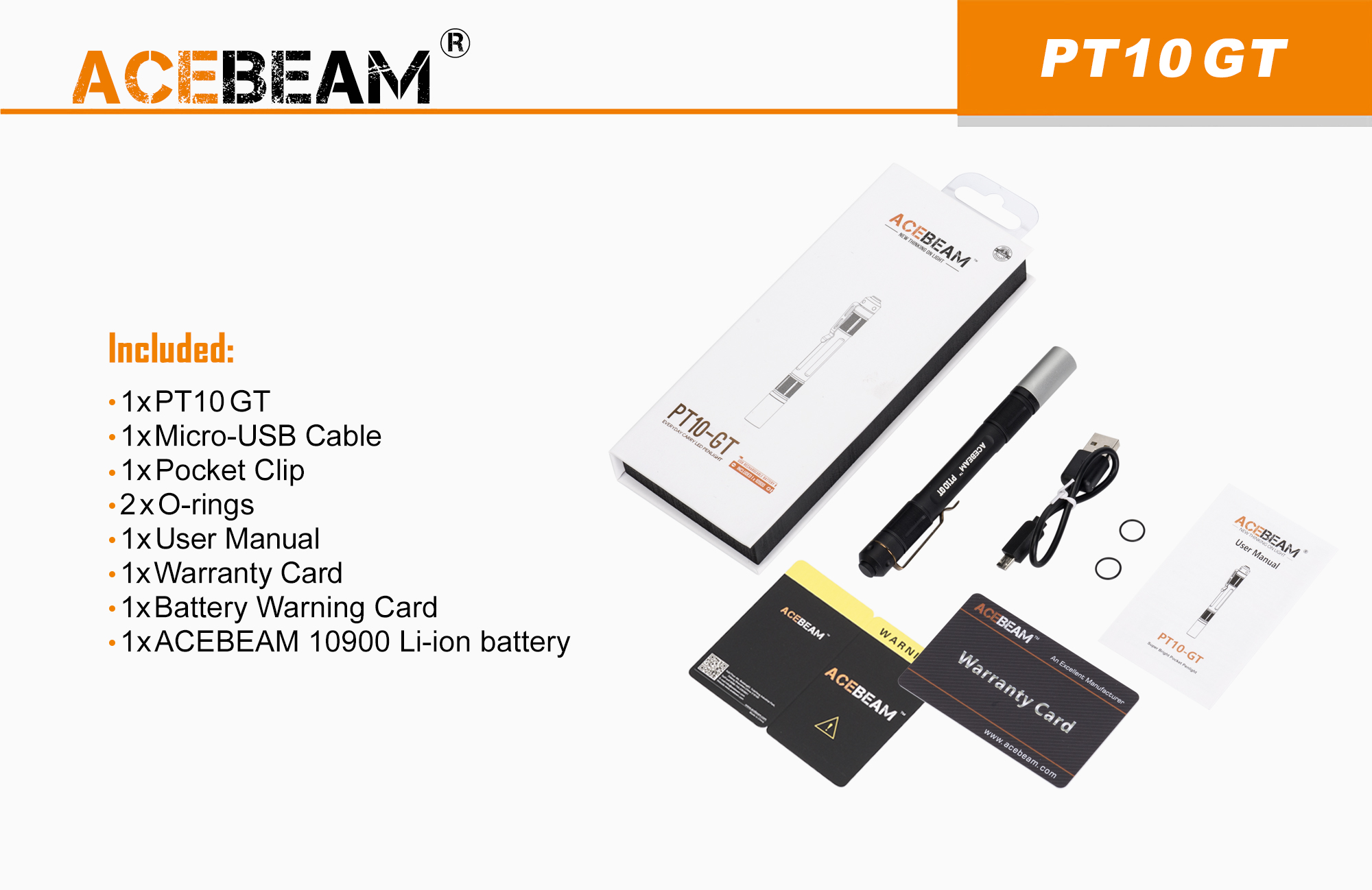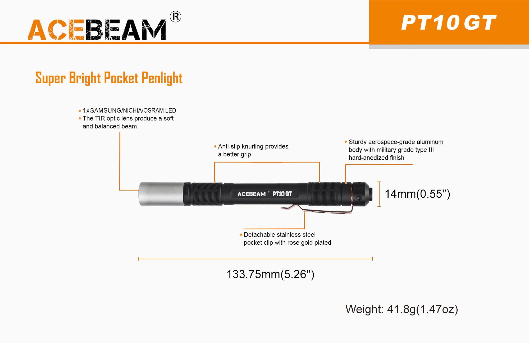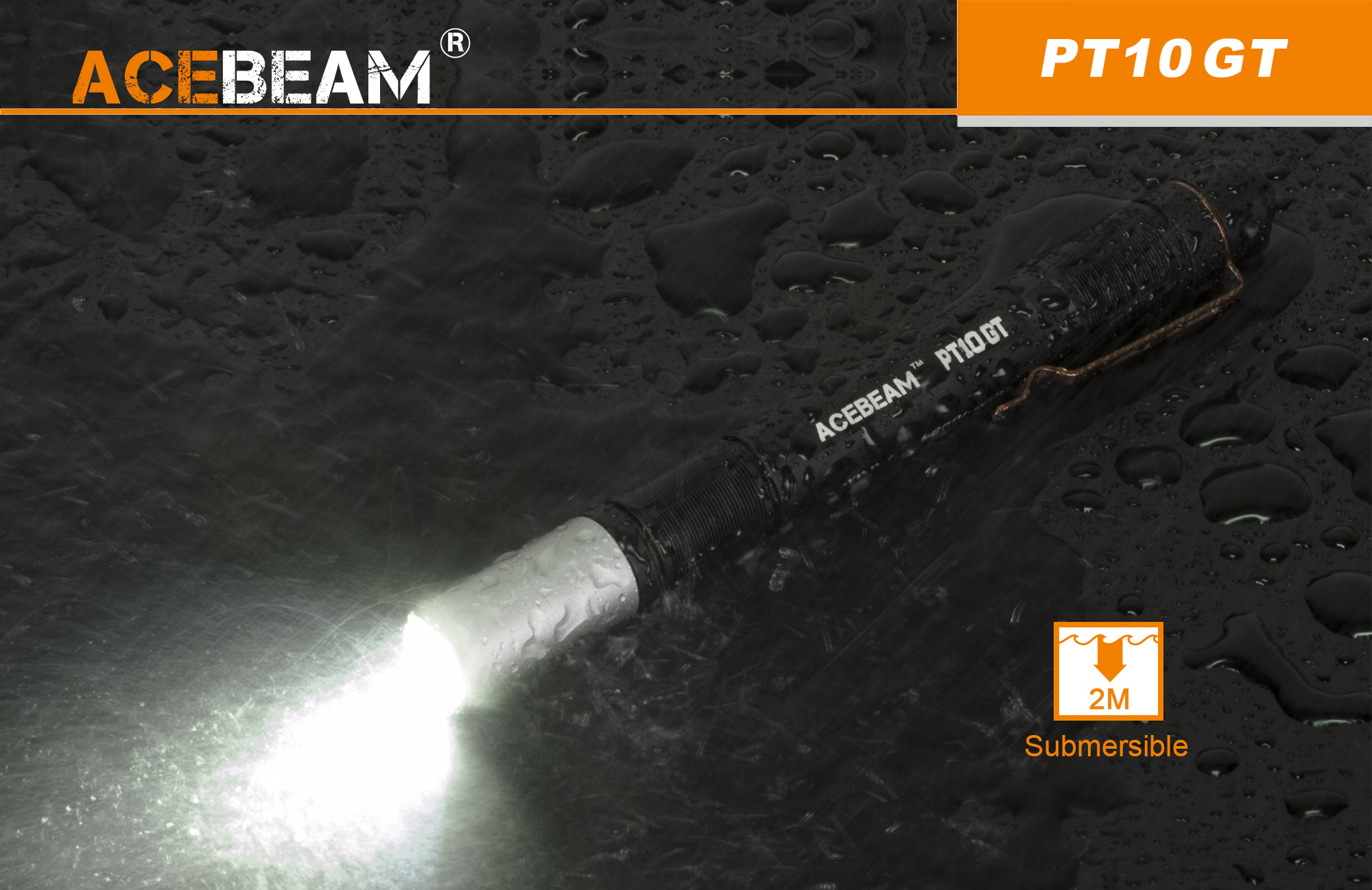 Die Acebeam PT10-GT ist eine leistungsstarke Lampe im Kugelschreiberformat. Die extrem kompakte und sehr helle Stift Taschenlampe ist bestückt mit einer NICHIA 219C LED und erreicht eine Farbtreue von CRI ≥90. Die Taschenlampe, die man wie ein Kuli einstecken kann, erreicht eine maximale Helligkeit von 200 Lumen bei einer Leuchtweite von 64 Metern. Der Heckschalter bietet eine intuitive Einhandbedienung mit sofortigem Zugriff auf alle Funktionen. Die Acebeam PT10-GT wird mit einem 10900 Lithium-Ionen-Akkus mit integrierte Ladebuchse betrieben. Das Gehäuse der Acebeam PT10-GT besteht aus HAIII anodisierten Luftfahrt-Aluminium und ist schlagbeständig und wasserdicht.