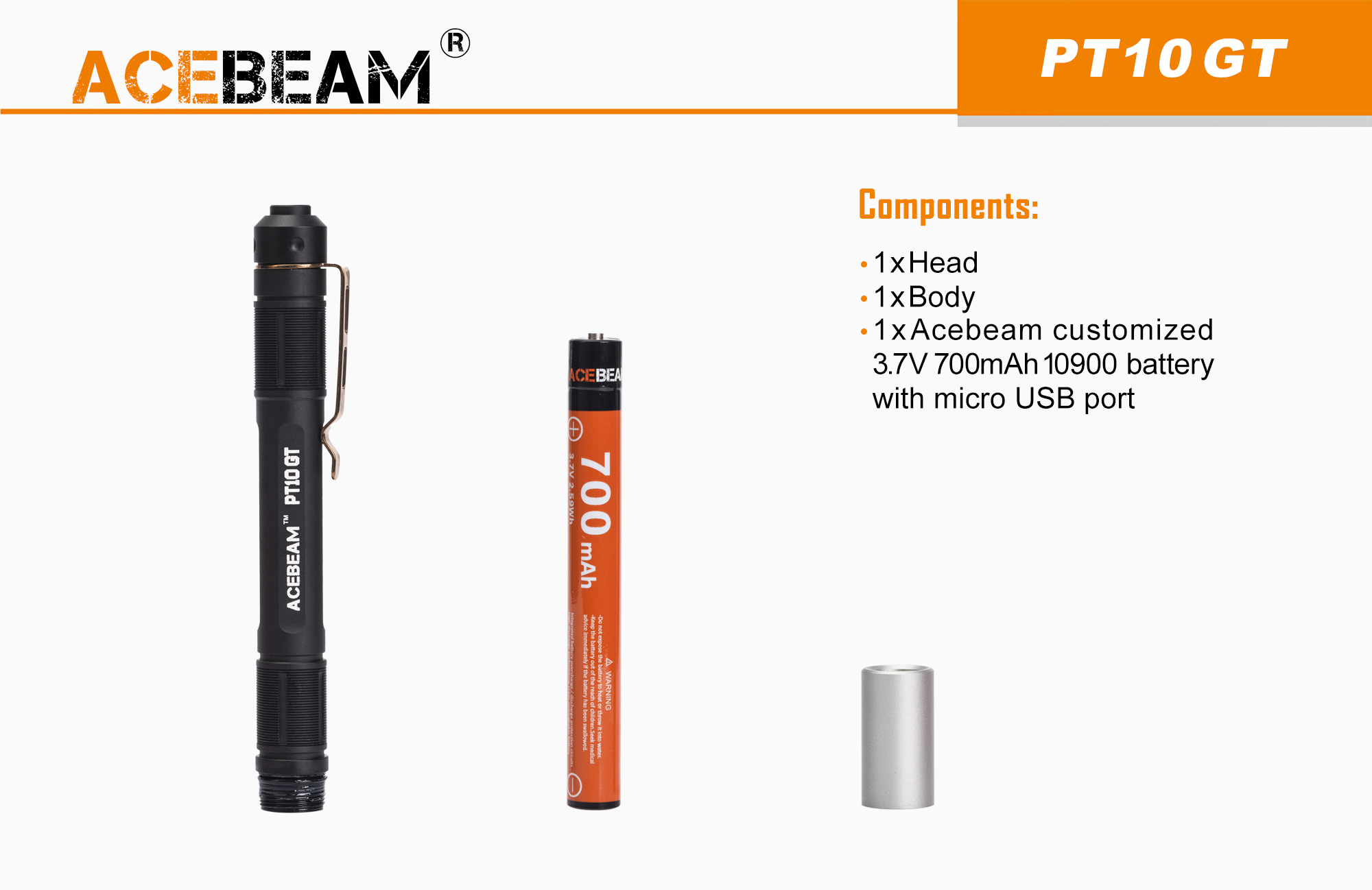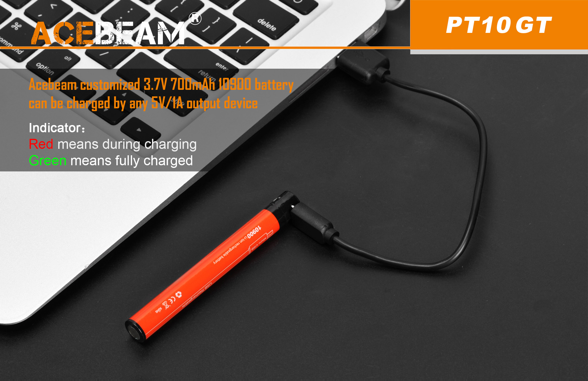 • Stromversorgung über 1x customized ACEBEAM 10900 wiederaufladbare Lithium-Ionen-Akkus mit MicroUSB Ladeport