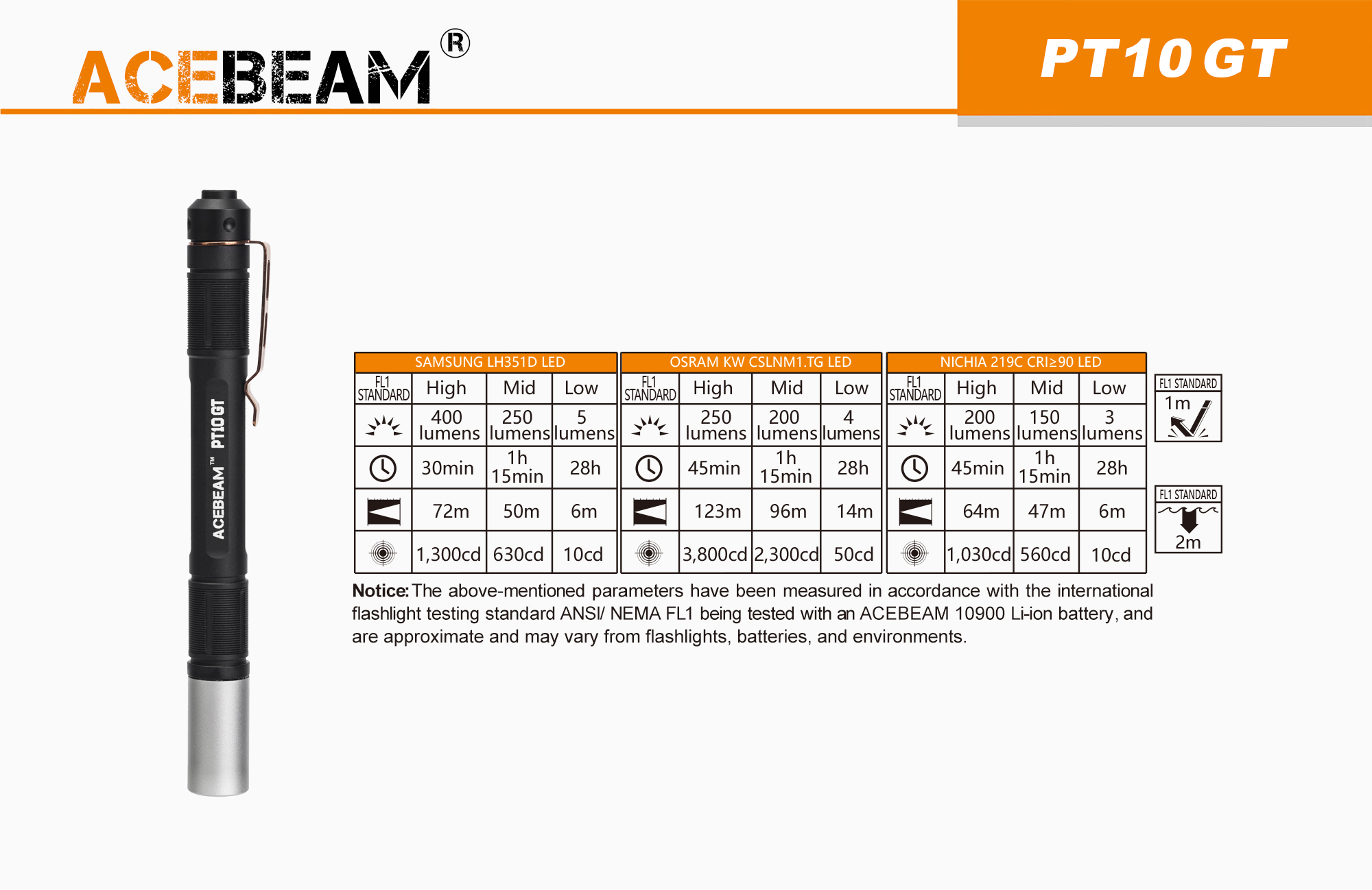 Acebeam PT10-GT - Stift LED Taschenlampe, NICHIA 219C LED, CRI ≥90, 400 Lumen, 10900 LiIon-Akku