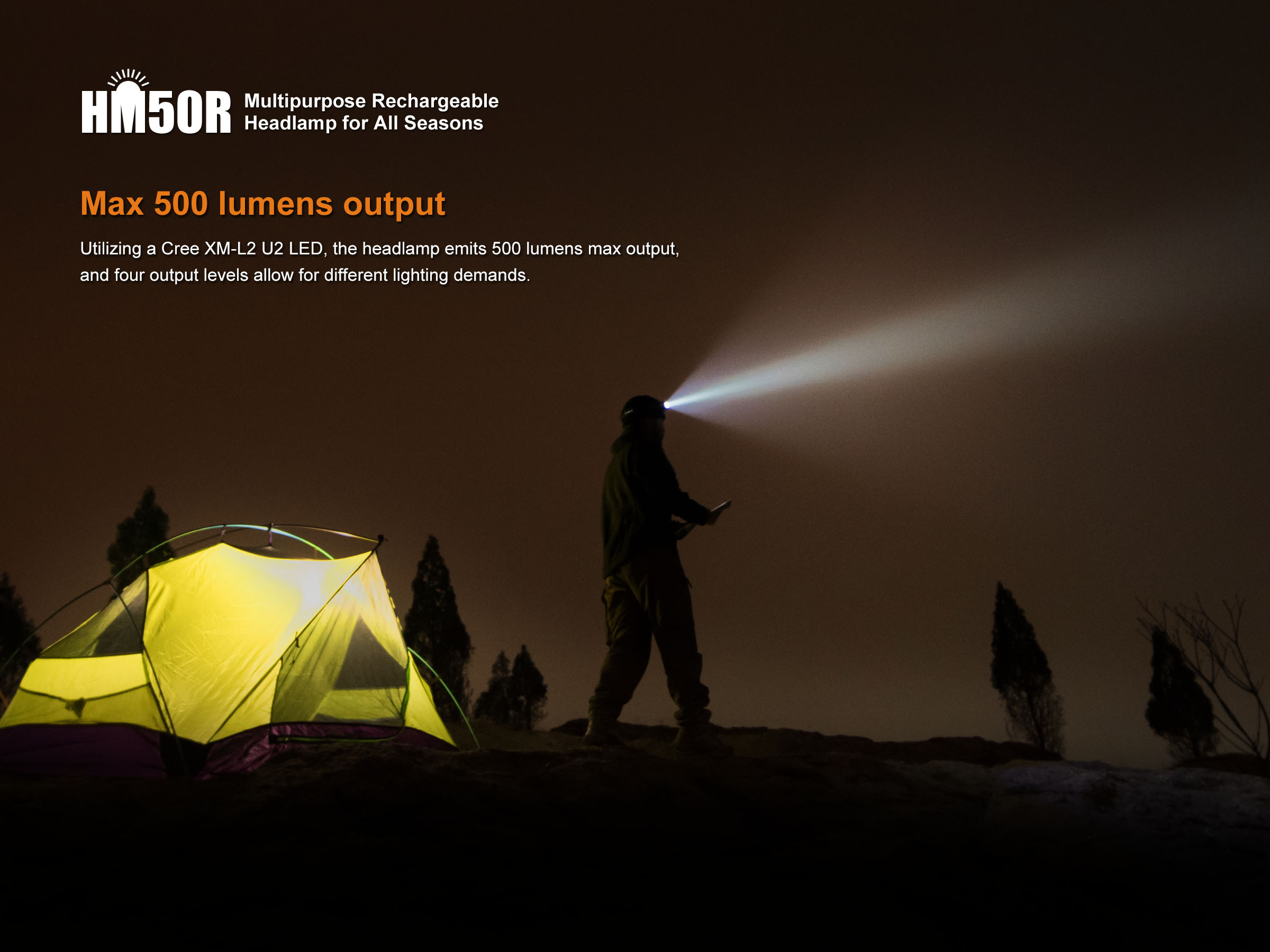 Fenix HM50R - Wiederaufladbare LED Stirnlampe, 500 Lumen, Cree XM-L2 U2, 16340 Akku