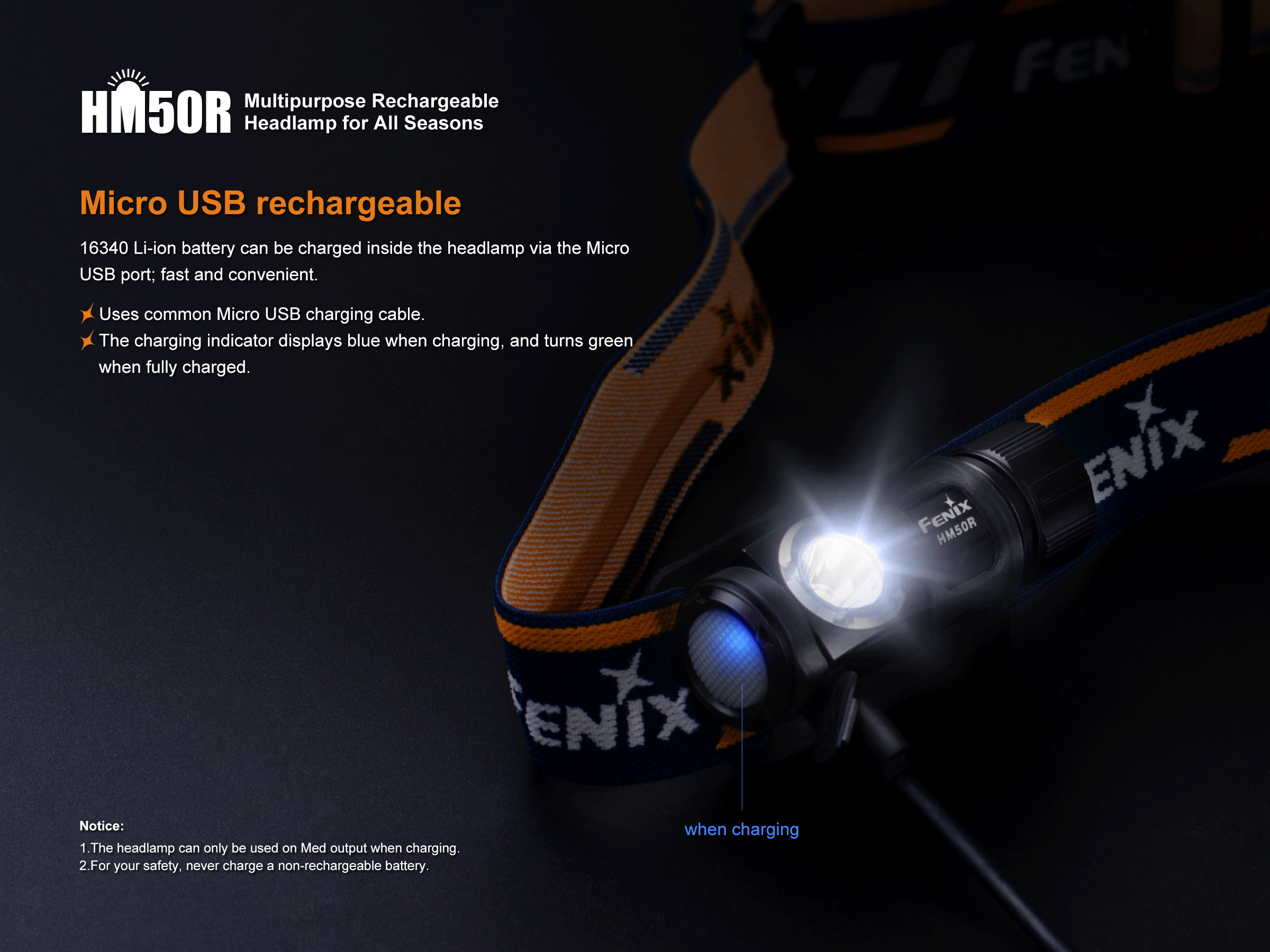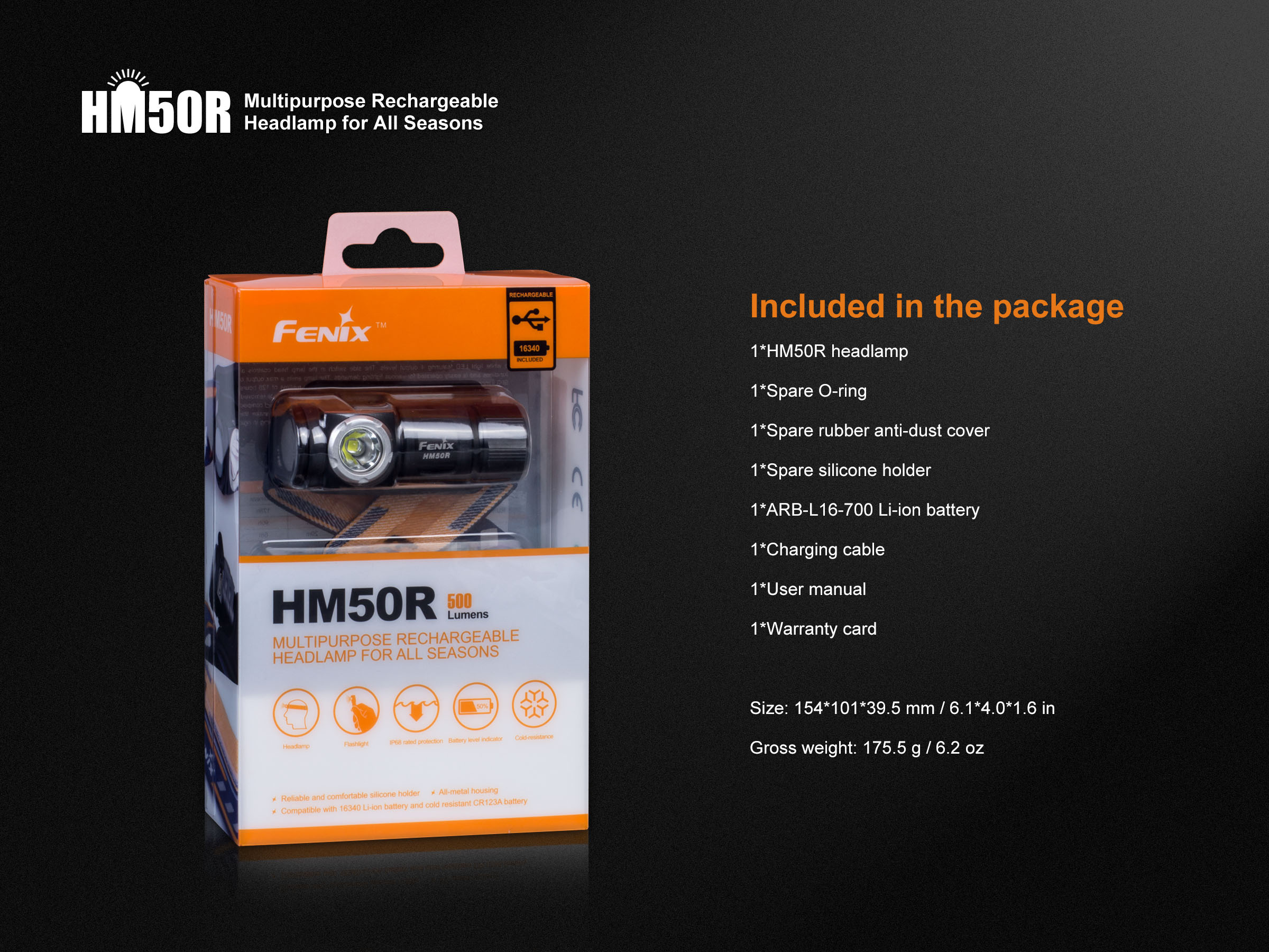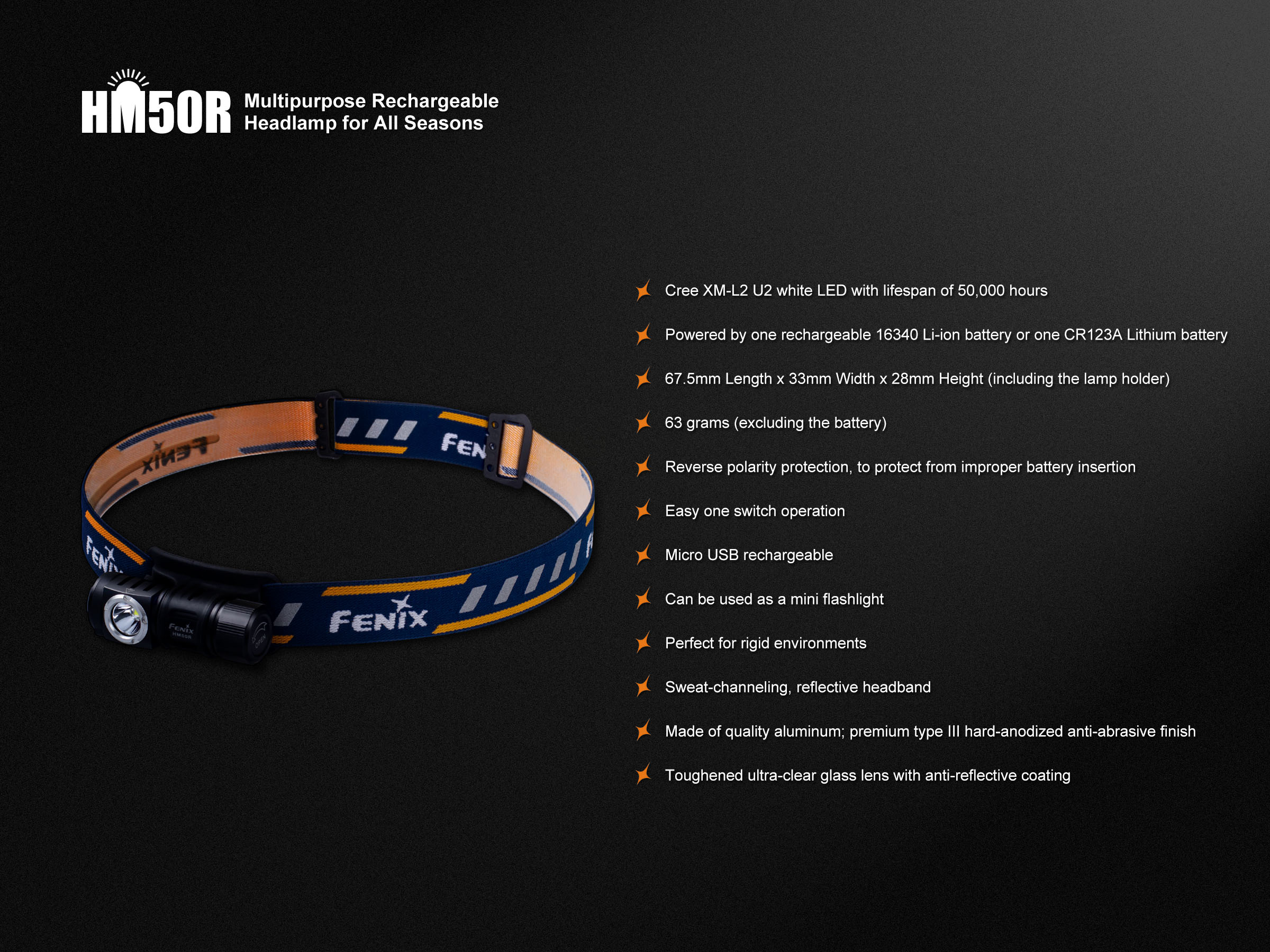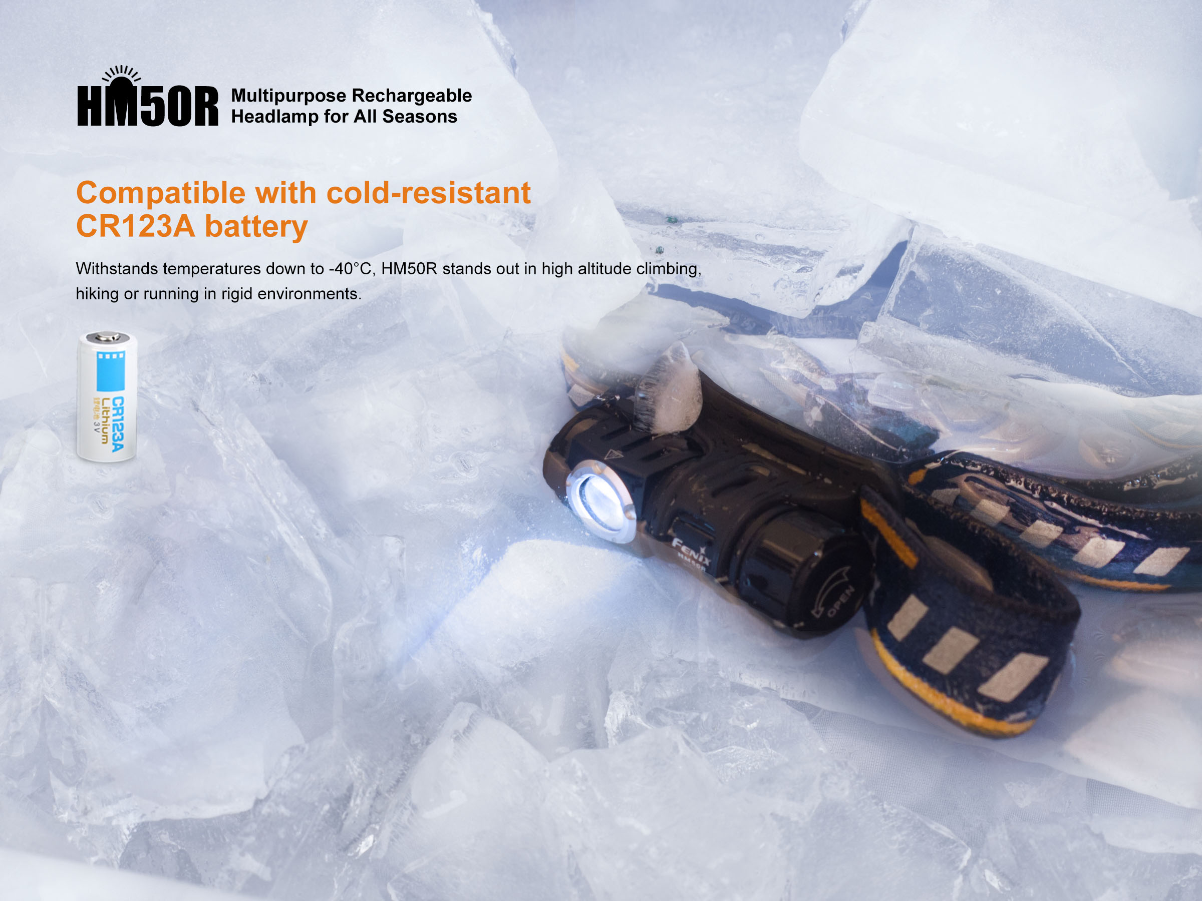 Die HM50R wird über einen aufladbaren 16340 Akku oder mit einer CR123A Batterie betrieben.