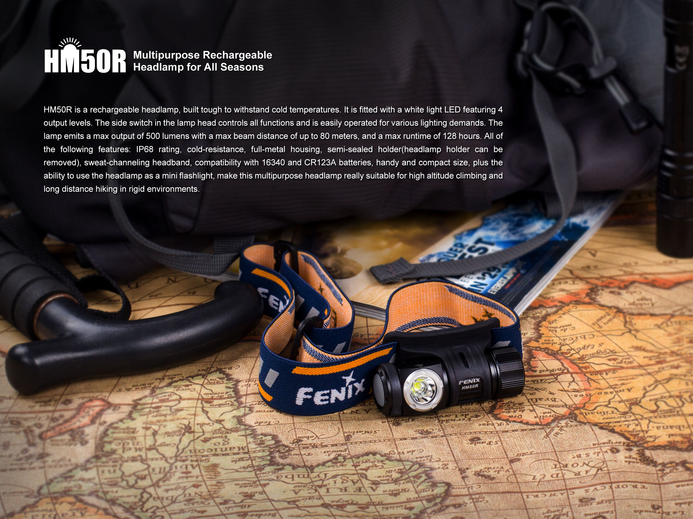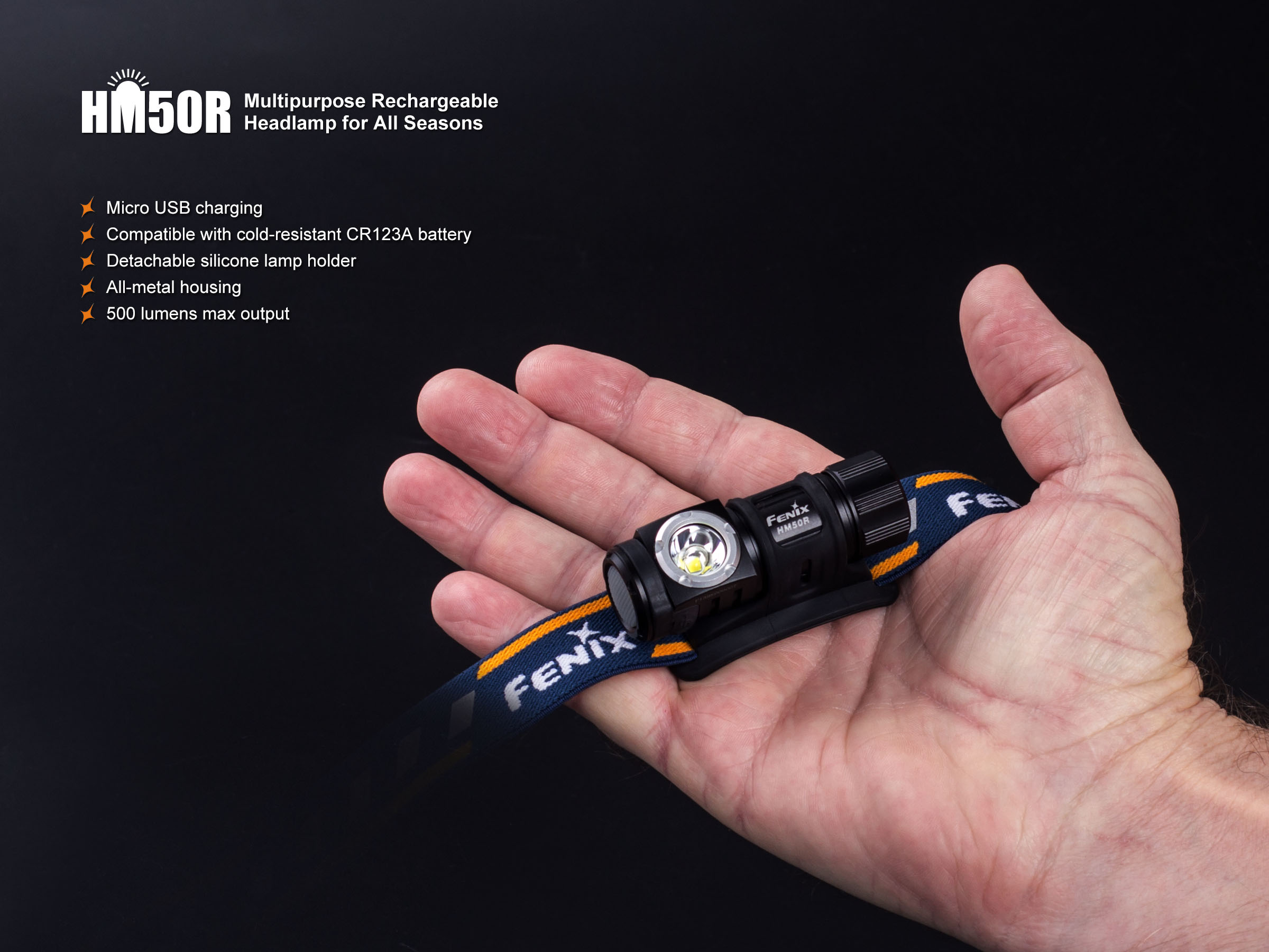 Die Fenix HM50R ist eine super leichte und kleine LED Stirnlampe mit sehr hellen 500 Lumen die man über ein microUSB Kabel wie ein Smartphone aufladen kann. Die Fenix HM50R Stirnlampe ist bis -40 Grad kälteresistent, schlagbeständig und wasserdicht. Die Lampe lässt sich auch aus dem Stirnband nehmen und als Taschenlampe verwenden. Die Fenix HM50R hat vier Leuchtstufen und eine Laufzeit von bis zu 128 Stunden.