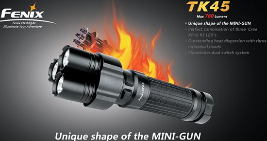 Sie haben nun folgende Möglichkeiten:Die Fenix TK45 verfügt über drei Cree XP-G R5 LED die eine Lichtleistung von 760 Lumen ermöglichen. Acht AA Batterien übernehmen die Energieversorgung und ermöglichen eine Leuchtzeit bis zu 2 Stunden bei voller Leistung. Diese Version der Fenix TK45 wird mit 8 AA Batterien ausgeliefert.
