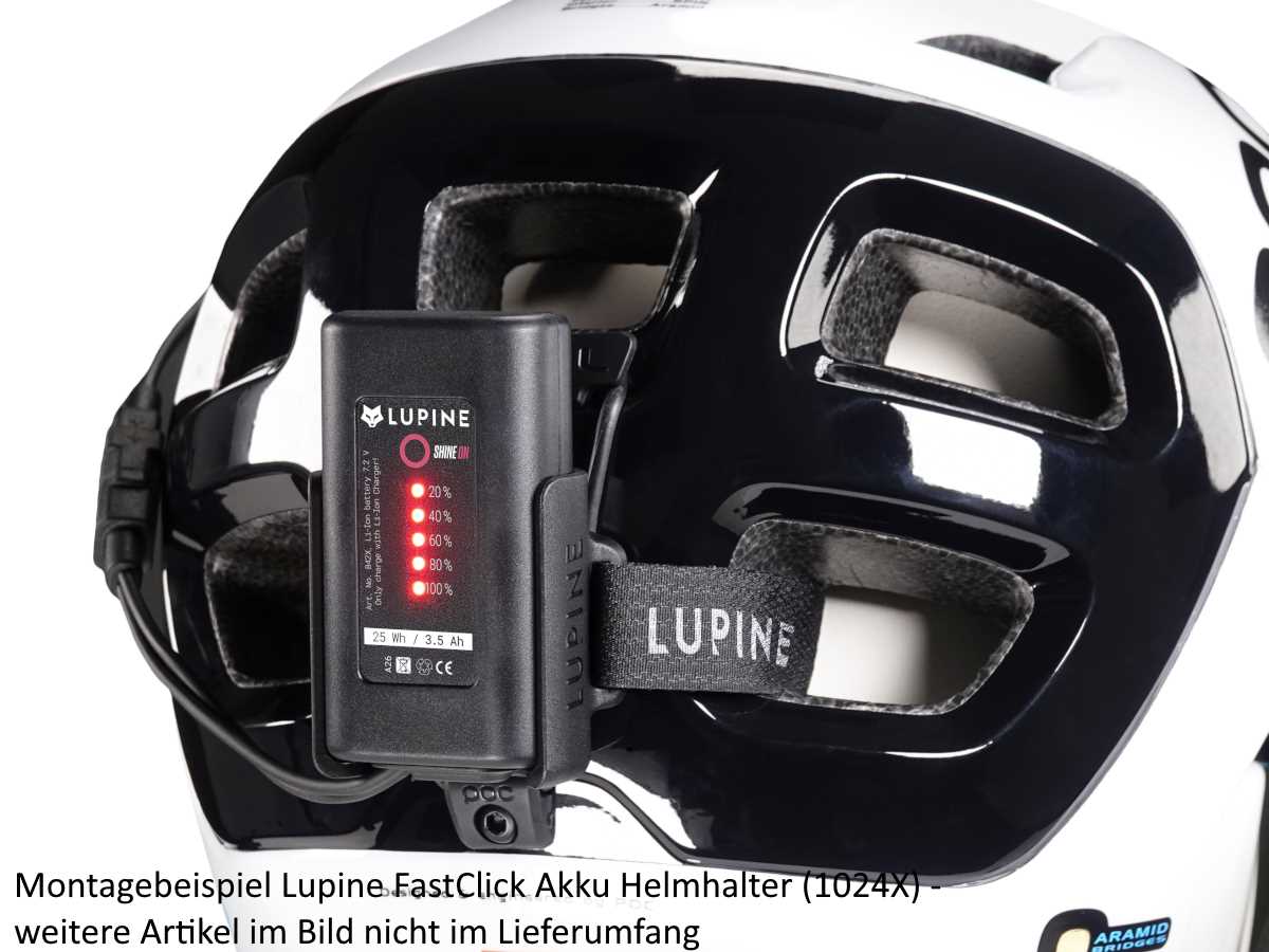 Lupine FastClick Akku Helmhalter (1024X) mit 28cm langem Klettband zur Befestigung an Helmen mit Lüftungsschlitzen. Der passende FastClick Akku wird sicher und schnell in die Halteschale eingeklickt. Ideal kombinierbar mit Lupine Helm und Stirnlampen. Passender Akku separat erhältlich.