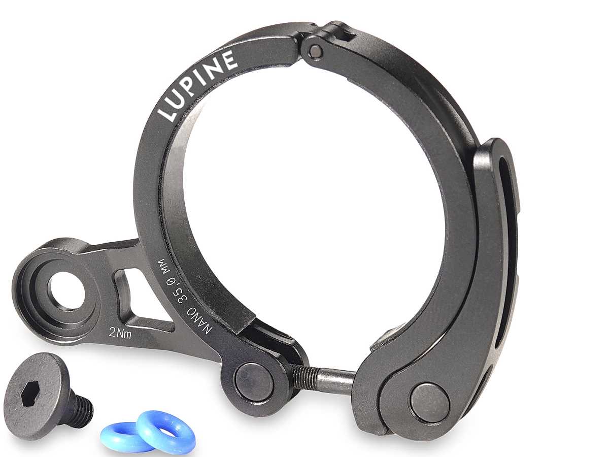 Lupine SL Nano AF Schnellspanner 35mm (7335X), einseitiger Schnellspanner zur flexiblen Montage der Lupine SL Nano AF Fahrradlampe an Fahrradlenkern, gefertigt aus schwarz eloxiertem Aluminium.