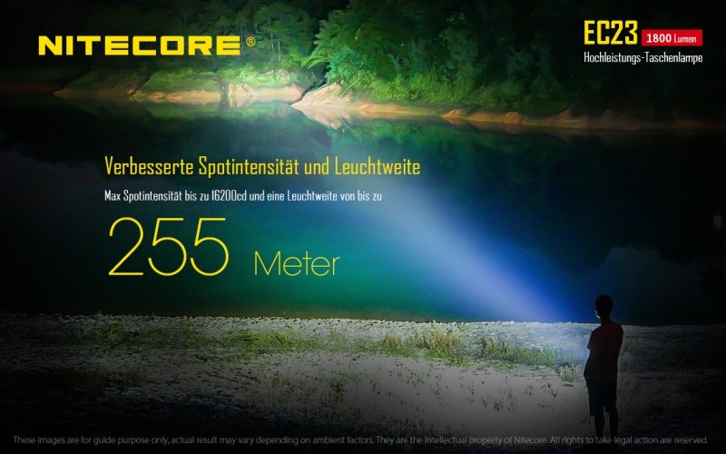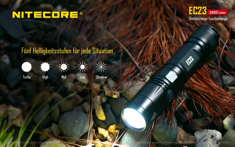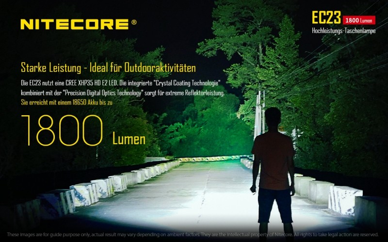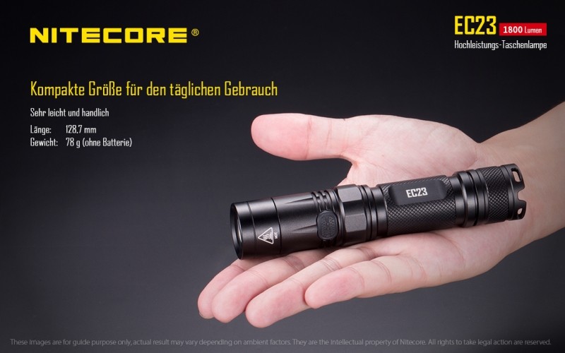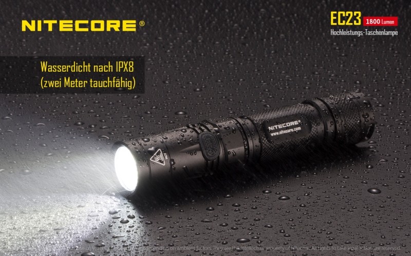 Sie haben nun folgende Möglichkeiten:Die Nitecore EC23 ist eine sehr helle 1800 Lumen Taschenlampe in einem kompakten Gehäuse für die Hosentasche. Mit der Hochleistungs CREE XHP35 HD E2 LED erreicht Nitecore EC23 eine Leuchtweite von 225 Meter und wir von der ART Temperaturregelung gegen Überhitzung überwacht. Mit dem seitlichen Schalter kann man in die fünf Helligkeitsstufen und die drei Spezialmodi schalten. Der seitlich Schalter mit der integrierten Betriebs-LED zeigt auf 0,1V die verbleibende Akkulaufzeit an. Die Nitecore EC23 hat fünf Helligkeitsstufen und die drei Spezialmodi (Strobe/SOS/Location Beacon). Mit dem im Lieferumfang befindlichen Nitecore 18650/35HP Li-Ion Akku erreicht die Nitecore EC23 eine Laufzeit von bis zu 330 Stunden.