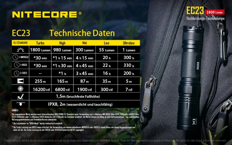 *Hinweis: Die ATR-Temperatursteuerung steuert die Temperatur der LED durch verringern der Helligkeit. Daher ist die Leuchtzeit im "TURBO/High"-Mode ein errechneter, theoretischer Wert. Die 1800 Lumen im "TURBO-Mode" können nur mit wiederaufladbaren 18650 Li-Ionen-Akkus mit einem Ausgangsstrom von mehr als 8A erreicht werden. Bei Verwendung von 18650 Li-Ionen-Akkus mit weniger als 8A ist der Turbo-Mode NICHT zugänglich oder die Lampe schaltet plötzlich ab. Der Turbo-Mode ist auch NICHT mit CR123A Batterien oder RCR123A Akkus erreichbar.
