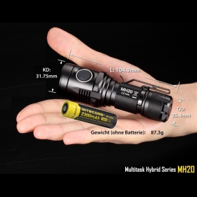 Sie haben nun folgende Möglichkeiten:Die Nitecore MH20 ist eine extrem kompakte LED Taschenlampe mit 1000 Lumen im ANSI/NEMA FL-1 Standard. Die CREE XM-L2 U2 LED erzeugt ein kalt weises Licht. Bei cool white LED erscheint der Lichtstrahl etwas heller und Konturen lassen sich besser erkennen. Mit einem 18650 Li-Ion Akku erreicht die kleine 10,5cm kurze Nitecore MH20 eine Laufzeit von bis zu 235 Stunden. Falls dies nicht reicht können Sie den Akku direkt über das eingebaute Ladegerät in der Lampe aufladen. Die Nitecore MH20 wird durch einen neuen Zwei-Wege-Schalter gesteuert. Über eine im Schalter integrierte LED kann die Batterie-/Akku-Spannung angezeigt werden. Die ATR Technologie verhindert durch eine dynamisch angepasste Lichtleistung eine Überhitzung der LED. Das Gehäuse der Nitecore MH20 besteht aus HAIII anodisierten Luftfahrt-Aluminium und ist Spritzwassergeschützt nach IPX-8.