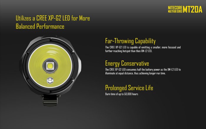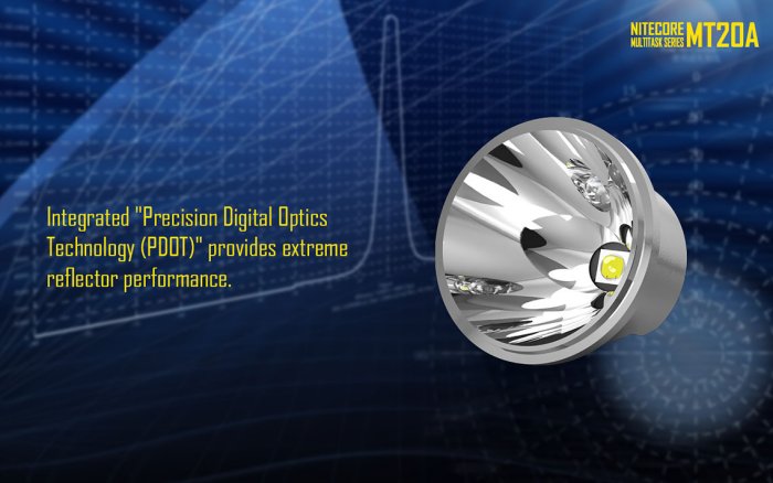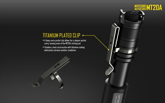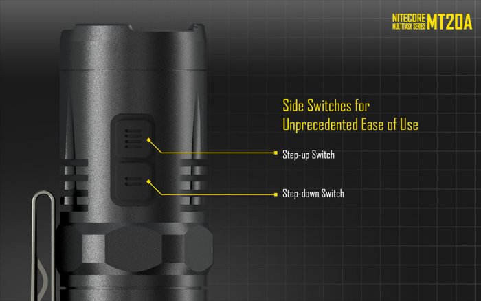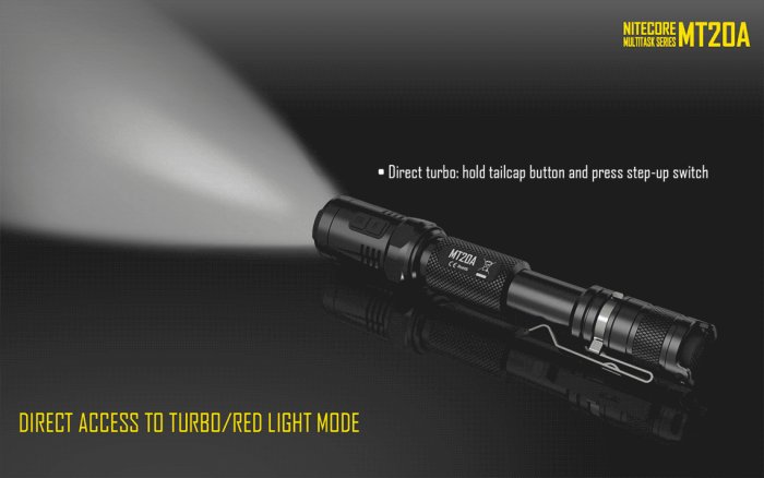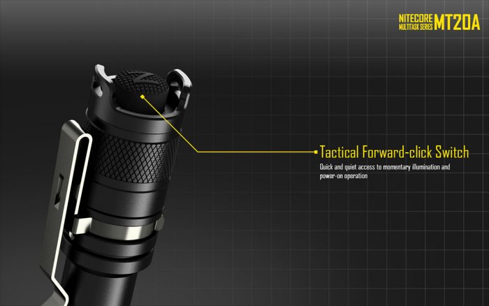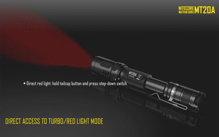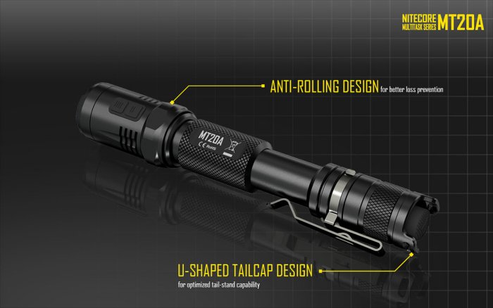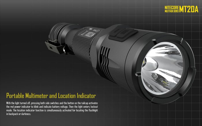 Die Nitecore MT20A ist eine LED Taschenlampe mit 960 Lumen im ANSI/NEMA FL-1 Standard. Die Nitecore MT20A unterscheidet sich von den bisherigen Modellen der MT-Serie durch ein neues Bedienkonzept. Ein Heckschalter zum Ein- und Ausschalten sowie zwei Side-Switches. Der vordere Side-Switch erhöht, der hintere verringert die Leuchtstufe. Man muss nicht mehr durch alle Modi schalten um zu einer kleineren Leuchtstufe zu gelangen. Außer der Haupt-LED gibt es noch eine rote LED. Diese gibt ein schwaches Rotlicht zur Ausleuchtung des Nahbereich um die Nachtsicht zu erhalten. Das Rotlicht gibt auch Informationen über den Batteriestand. Das Gehäuse der Nitecore MT20A besteht aus HAIII anodisierten Luftfahrt-Aluminium und ist Spritzwassergeschützt nach IPX-8.