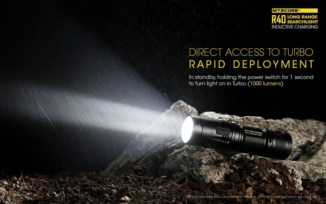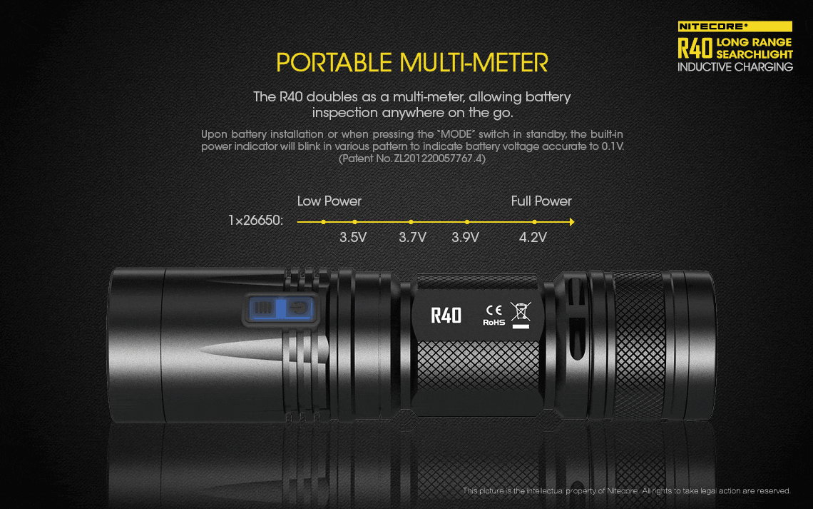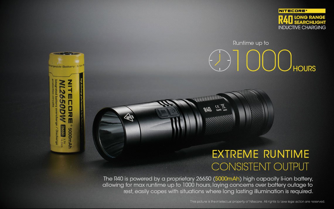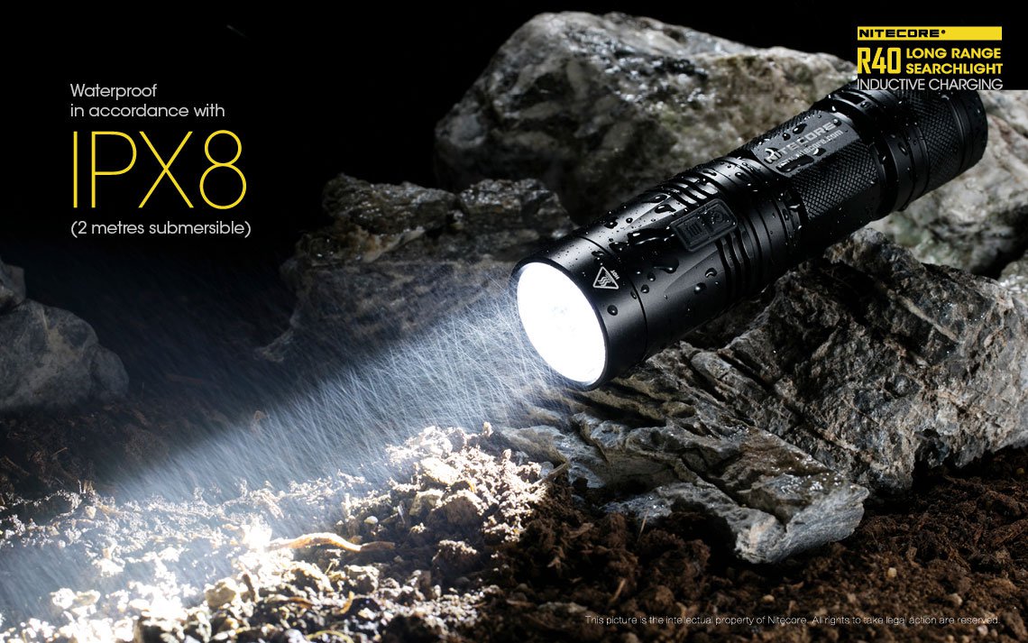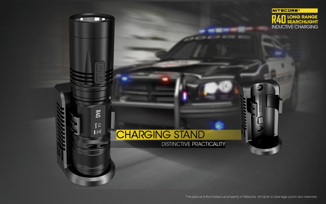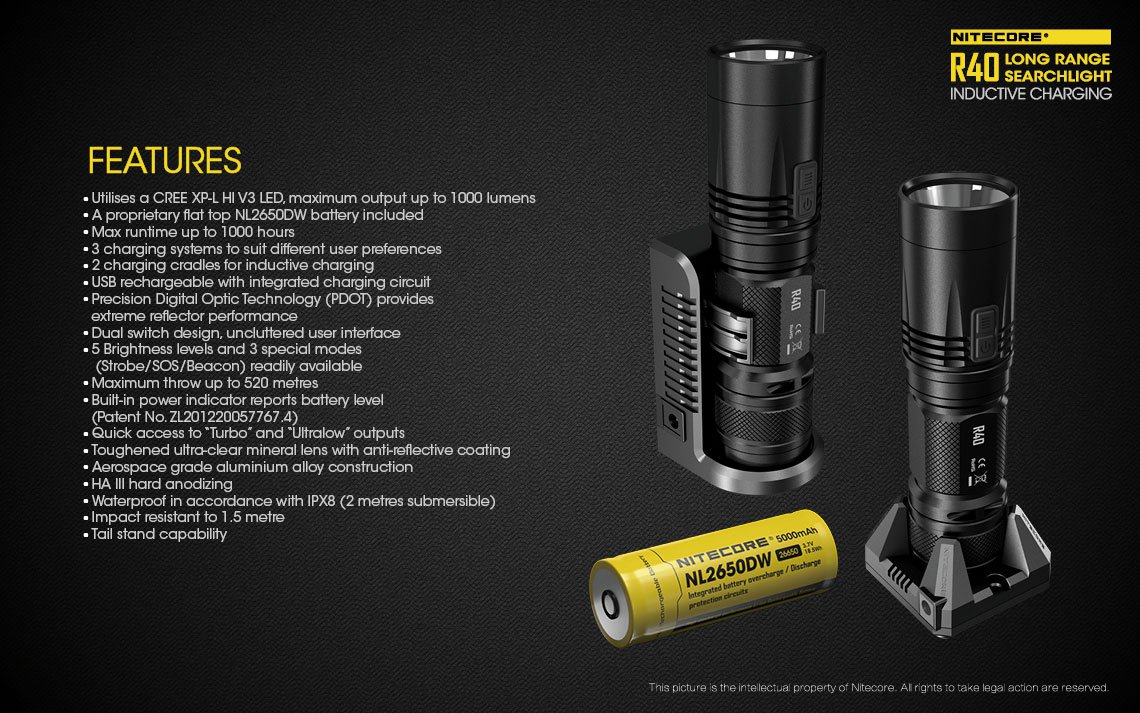 Die Nitecore R40 ist eine LED Taschenlampe mit induktiver Ladefunktion. Es ist eine induktive Tischladestation und eine induktive Wand.- und KFZ-Ladestation im Lieferumfang. Man kann aber die Nitecore R40 auch über ein microUSB Aufladen. Die Cree HP-L Hi V3 LED erreicht 1000 Lumen Lichtleistung und 520 Meter Leuchtweite. Mit dem 26650 Li-Ion Akku mit 5000mAh hat die Nitecore R40 eine Laufzeit von bis zu 1000 Stunden. Die Nitecore R40 verfügt über zwei Schalter für den schnellen Zugriff auf die fünf Leuchtstufen und die drei Sondermodi (SOS, Strobe, Beacon). Die Ladeanzeige zeigt den Akkustand auf 0,1V genau an. Das Gehäuse der Nitecore R40 besteht aus HAIII anodisierten Luftfahrt-Aluminium und ist Spritzwassergeschützt nach IPX-8.