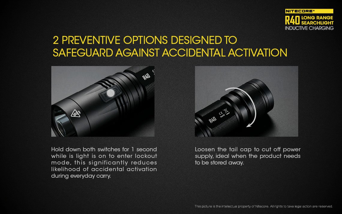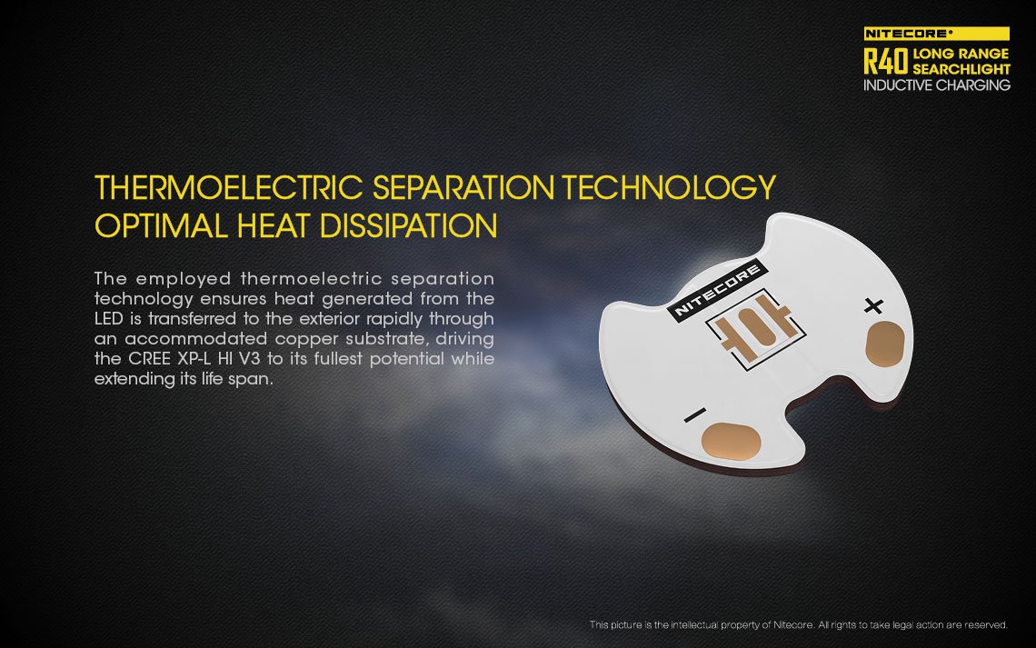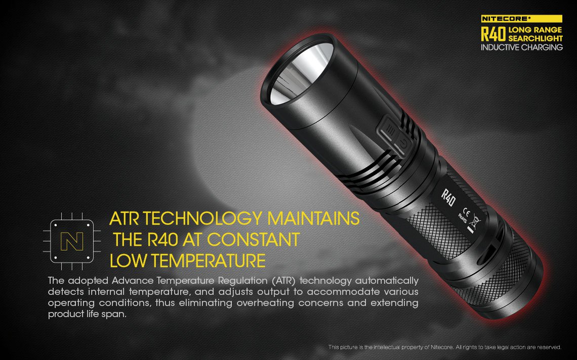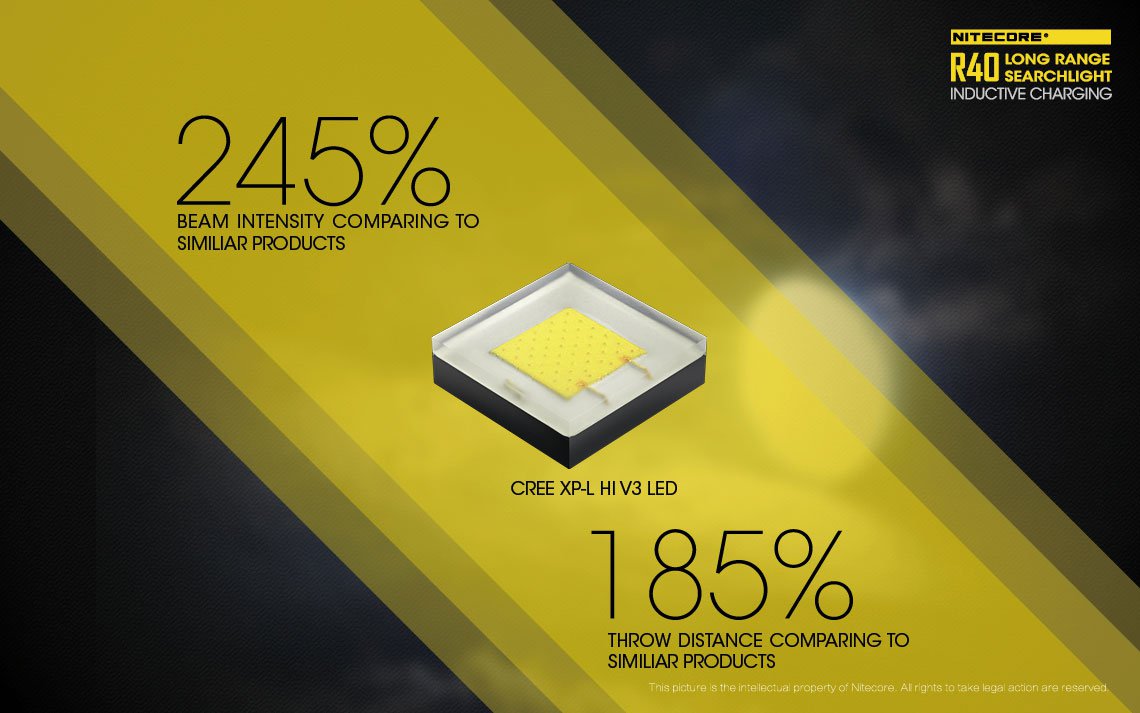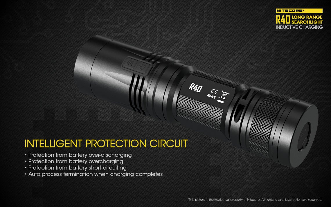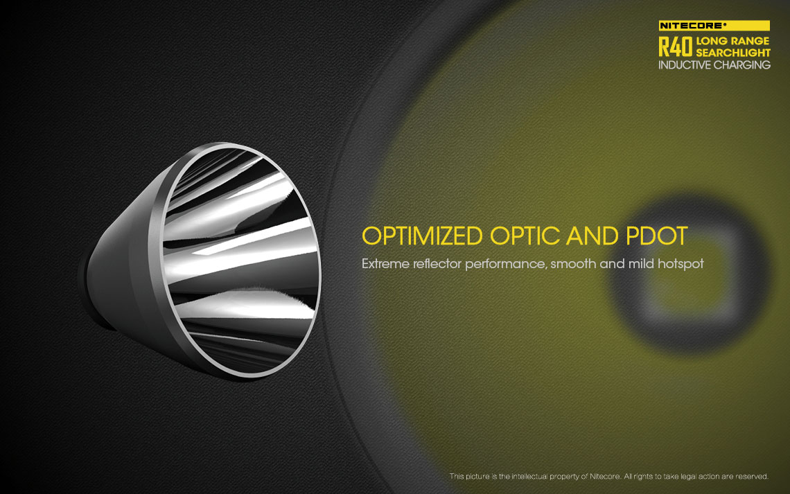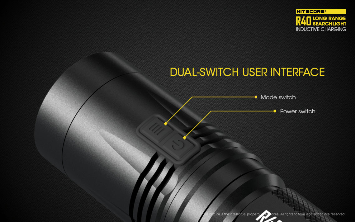 Die Nitecore R40 ist eine LED Taschenlampe mit induktiver Ladefunktion. Es ist eine induktive Tischladestation und eine induktive Wand.- und KFZ-Ladestation im Lieferumfang. Man kann aber die Nitecore R40 auch über ein microUSB Aufladen. Die Cree HP-L Hi V3 LED erreicht 1000 Lumen Lichtleistung und 520 Meter Leuchtweite. Mit dem 26650 Li-Ion Akku mit 5000mAh hat die Nitecore R40 eine Laufzeit von bis zu 1000 Stunden. Die Nitecore R40 verfügt über zwei Schalter für den schnellen Zugriff auf die fünf Leuchtstufen und die drei Sondermodi (SOS, Strobe, Beacon). Die Ladeanzeige zeigt den Akkustand auf 0,1V genau an. Das Gehäuse der Nitecore R40 besteht aus HAIII anodisierten Luftfahrt-Aluminium und ist Spritzwassergeschützt nach IPX-8.