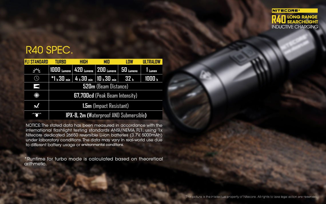 Hinweis: Die zuvor genannten Werte wurden im Labor unter der Verwendung von eines Nitecore NL2650DW mit 5000mAh ermittelt und können zwischen Taschenlampe, Batterien / Akkus und Umgebung abweichen.