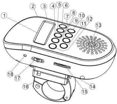 - Bringen Sie die beiliegende Fahrrad-Halterung (16) links oder rechts am Lenker an. Lösen Sie hierzu die Schraube vollständig und klappen Sie die Fahrrad-Halterung auf. Setzen Sie die Halterung an die gewünschte Stelle des Lenkers; die offene Seite der Halterung muss dabei zum Vorderrad zeigen. Achten Sie darauf, dass der Gummieinsatz eingesetzt ist, damit ein sicherer Halt gewährleistet ist und der Lenker gegen Beschädigungen geschützt ist.