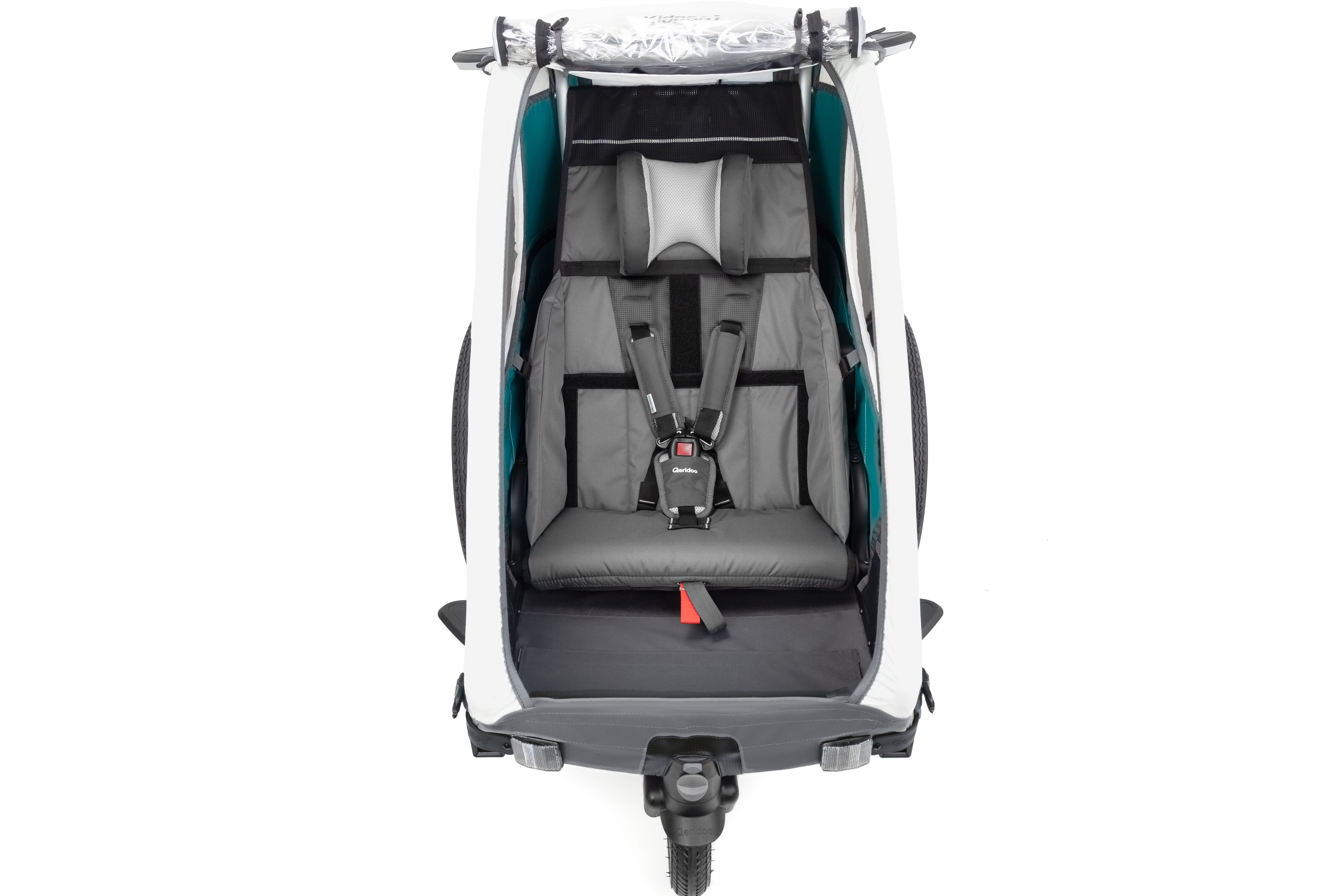 Der richtungweisende Kopfprotektor (Nur in Zweisitzer-Modelle) schafft einen zusätzlichen Sicherheitsabstand zwischen dem Kopf des Kindes und der Fahrbahn, sollte es einmal zu einem Unfall kommen. Vor allem beim Transport von zwei Kindern