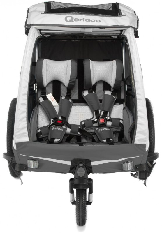 Der Qeridoo KidGoo2 2017 ist ein Kinderfahrradanhänger für zwei Kinder. Der Anhänger ist mit einer einstellbaren Blattfederung und einer Feststellbremse am Schiebegriff ausgestattet. Die Fahrradkupplung und ein Buggyrad mit Jogger-Funktion gehören zum Lieferumfang. Das FX-Klappsystem ermöglicht ein einfaches Zusammenfalten des Qeridoo KidGoo2 2017 mit nur einer Handbewegung. Ein Augenmerk wurde auf den Transport von Säuglingen gelegt. Mit dem optionalen Adapter ist es möglich eine Qeridoo oder eine Maxi-Cosi Autokindersitzschale in den Qeridoo KidGoo2 2017 mit einzubauen um die größtmögliche Sicherheit der -Kleinen- zu gewährleisten.