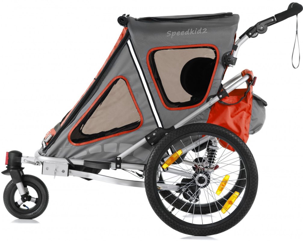 Der Qeridoo Speedkid2 2017 ist ein Kinderfahrradanhänger für ein oder zwei Kinder mit verdunkeltem Panoramadach. Der leichte Aluminium-Fahrradanhänger hat ein sehr kleines Packmaße (25x71x89cm) und passt damit in jeden PKW Kofferraum. Der Anhänger ist mit einer Luft-Sprungfederung und Feststellbremse ausgestattet. Die Fahrradkupplung und ein Buggyrad mit Jogger-Funktion gehören zum Lieferumfang. Das FX-Klappsystem ermöglicht ein einfaches Zusammenfalten des Qeridoo Speedkid2 2017 mit nur einer Handbewegung. Der Leichte und sichere Qeridoo Speedkid2 2017 kann man dank des großem Lieferumfangs als Babyjogger, Kinderwagen oder Fahrradanhänger nutzen.