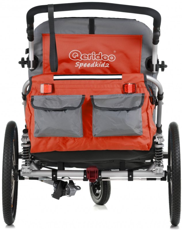 Der Qeridoo Speedkid2 2017 ist ein wahrer Alleskönner. Er kann als Einsitzer oder auch als Zweisitzer verwendet werden und ermöglicht Ihnen somit gelegentlich auch einen Freund Ihres Kindes mitfahren zu lassen. Die gepolsterte Sitzfläche mit einem Kopfkissen bietet den Kleinen extra Schutz und Komfort während der Fahrt. Die Fenster sind von allen Seiten verdunkelt und mindern die UV-Einstrahlung zum Schutz Ihrer Kleinen. Ein Dachfenster mit integriertem Sonnenschutz ist ebenfalls enthalten. Auffallende Designs mit stechenden Farben sorgen zusätzlich für eine gute Sichtbarkeit im Straßenverkehr. Der geräumige Innenraum bietet ausreichend Platz und zusätzlich sorgt eine große Tasche für ausreichend Stauraum. Die neue Handybar-Deichsel ist abnehmbar und lässt sich somit auch bei voll beladenem Anhänger bequem einsetzen. Mit einem Handgriff lösen Sie dazu einfach den Arretierungsknopf an der Deichselaufnahme, ziehen die Deichsel aus der Halterung heraus und setzen sie auf der anderen Seite wieder ein. Somit ist ein einfacher Wechsel zwischen dem Walker- und Trailermodus möglich.