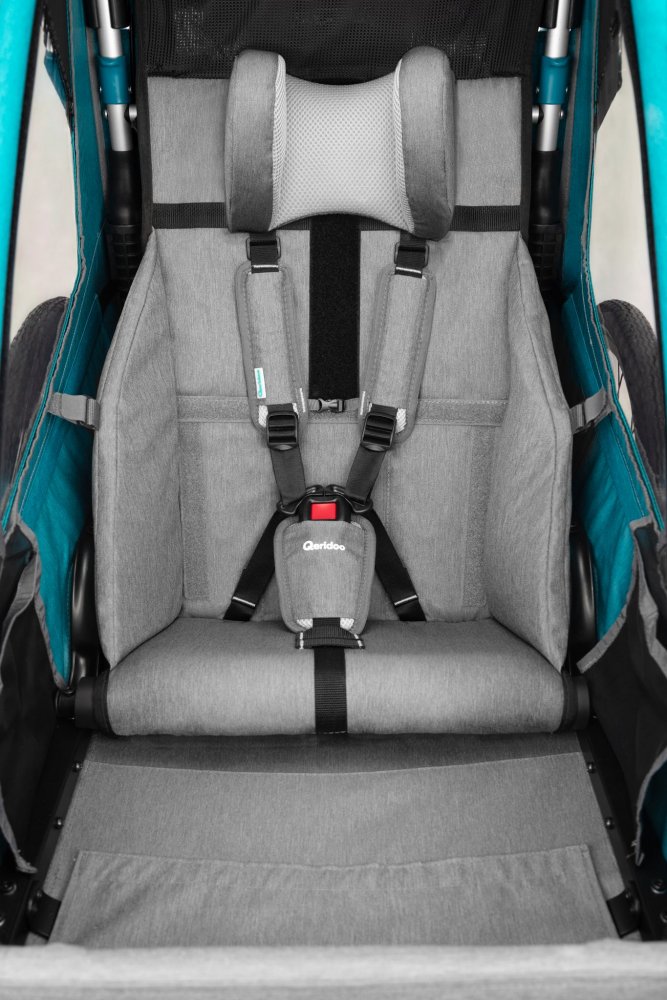 Der Qeridoo Sportrex1 ist voll gefederter Kinderfahrradanhänger für 1 Kind. Der Qeridoo Sportrex1 zeichnet sich besonders durch seine sportliche Optik und tolle Aerodynamik aus. Er bietet ein gutes Preis-Leistungs-Verhältnis und bringt zusätzliche Komfortfunktionen mit. Die Kopfstützen des Qeridoo Sportrex1 sind bereits im Lieferumfang enthalten und sorgen für eine komfortable Haltung des Kopfes. Aufgrund seiner schmalen Durchfahrtsbreite ist der Kinderfahrradanhänger auch als Buggy optimal nutzbar. Der Qeridoo Sportrex1 ist mit einem innovativen Blattfeder-Dämpfersystem ausgestattet, das auch in unebenem Gelände für eine sehr gute Schockabsorbierung sorgt.