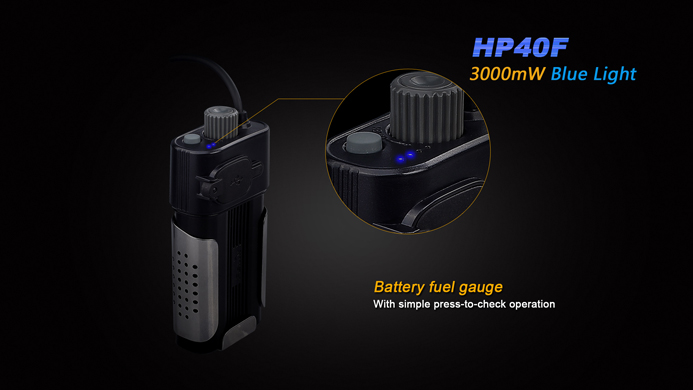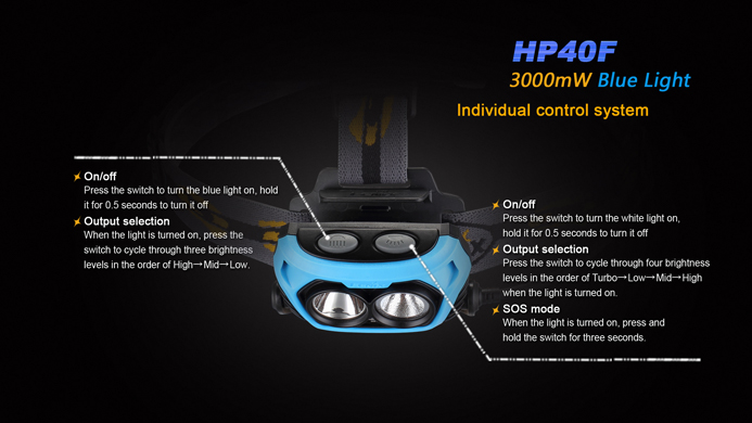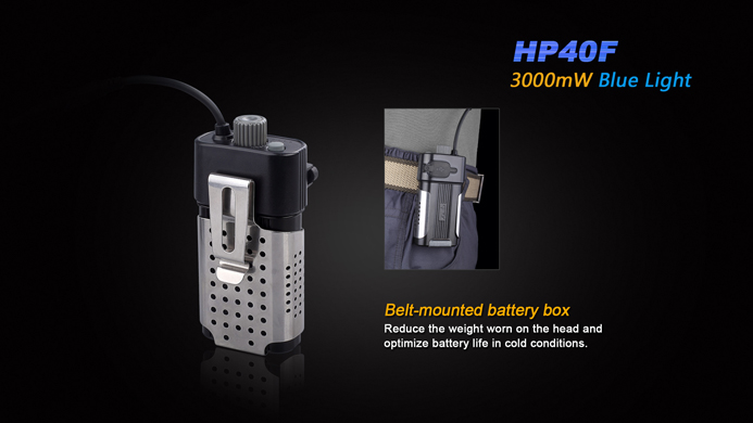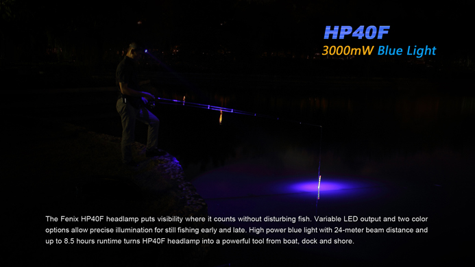 Die Fenix HP40F Stirnlampe ist speziell für die Anforderungen beim Angeln entwickelt worden. Die Fenix HP40F Angler Stirnlampe besitzt zwei unabhängig steuerbaren LED. Das weiße Flutlicht bringt 450 Lumen und eine Leuchtweite von 110 Meter. Das spezielle blaue Licht um Fische nicht zu stören hat 50 Lumen und 24 Meter Leuchtweite. Sehr durchdacht ist auch die Akkubox. Diese hat einen USB Anschluss an dem Sie Ihre mobilen Geräte wie Smartphone und MP3 Player aufladen können. Diese Version der Fenix HP40F wird OHNE Batterien / Akku ausgeliefert.