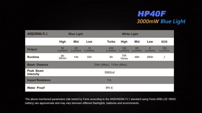 - Hinweis: Die Werte wurden im Fenix Labor unter der Verwendung von 2 Stück Fenix ARB-L2S LiIon Akkus mit 3.400 mAh Kapazität ermittelt. Sie können je nach Stirnlampe, Temperatur und verwendeter Batterien / Akkus unterschiedlich ausfallen.