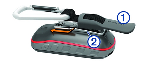 - Befestigen Sie den Karabinerclip in die dafür vorgesehenen Schienen-Aufnahme an der Gehäuserückseite des Oregon.