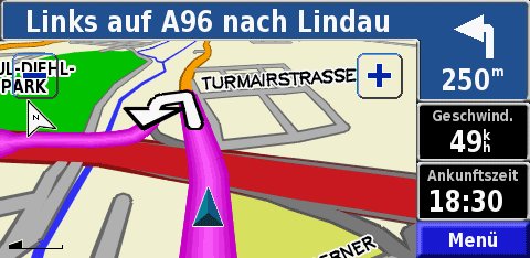 | Darstellung: | 3D-Darstellung, feinstufig zoombar, 10 Zoomstufen, bei weiterem Herauszoomen schrittweiser Übergang zur 2D-Darstellung; 2D- Darstellung in Fahrtrichtung; 2D-Darstellung mit Norden oben Die 2D-Darstellung kann mit 24 Maßstäben von 30m bis 1200km gezoomt werden; |