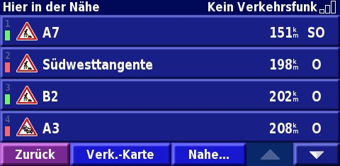 Mit einem optionalen Verkehrsfunkempfänger (Der optionale Verkehrsfunkempfänger arbeitet mit TMC, dem Traffic Message Channel im RDS-Radiodatensystem der UKW-Verkehrsfunksender. Der Empfang der Daten ist in Deutschland und den meisten Ländern Europas kostenlos.) beherrscht der StreetPilot 7200 die dynamische Routenberechnung. Wird eine Staumeldung für die aktuelle Route empfangen, dann berechnet der Streetpilot 7200 eine Ausweichroute - auf Wunsch vollautomatisch! Auf der Karte am Bildschirm werden außerdem Strecken, für die Behinderungen gemeldet wurden, mit entsprechenden Symbolen gekennzeichnet - auch abseits der aktuellen Route. So haben Sie jederzeit den Überblick über die aktuelle Verkehrslage.