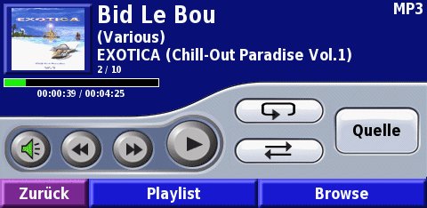 | Anzeige: | horizontal (Touchscreen), WQVGA color mit Hintergrundbeleuchtung (autom. Dimmung über Fotosensor oder manuell) Beleuchtete Tasten ( auch die der Fernbedienung) 480 x 234 Pixel, bei 15,5 cm Breite und 8,5 cm Höhe. (17,5 cm diagonal) |