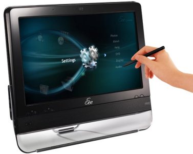 Der 15,6 Zoll Bildschirm des Asus Eee Top ist berührungsempfindlich und kann wahlweise mit dem Finger bzw. einem Stift oder über die mitgelieferte externe Tastatur