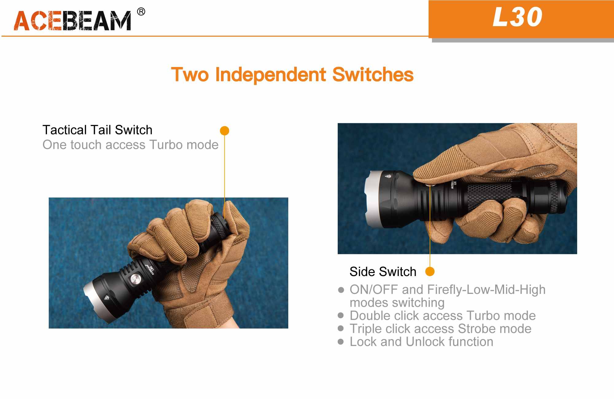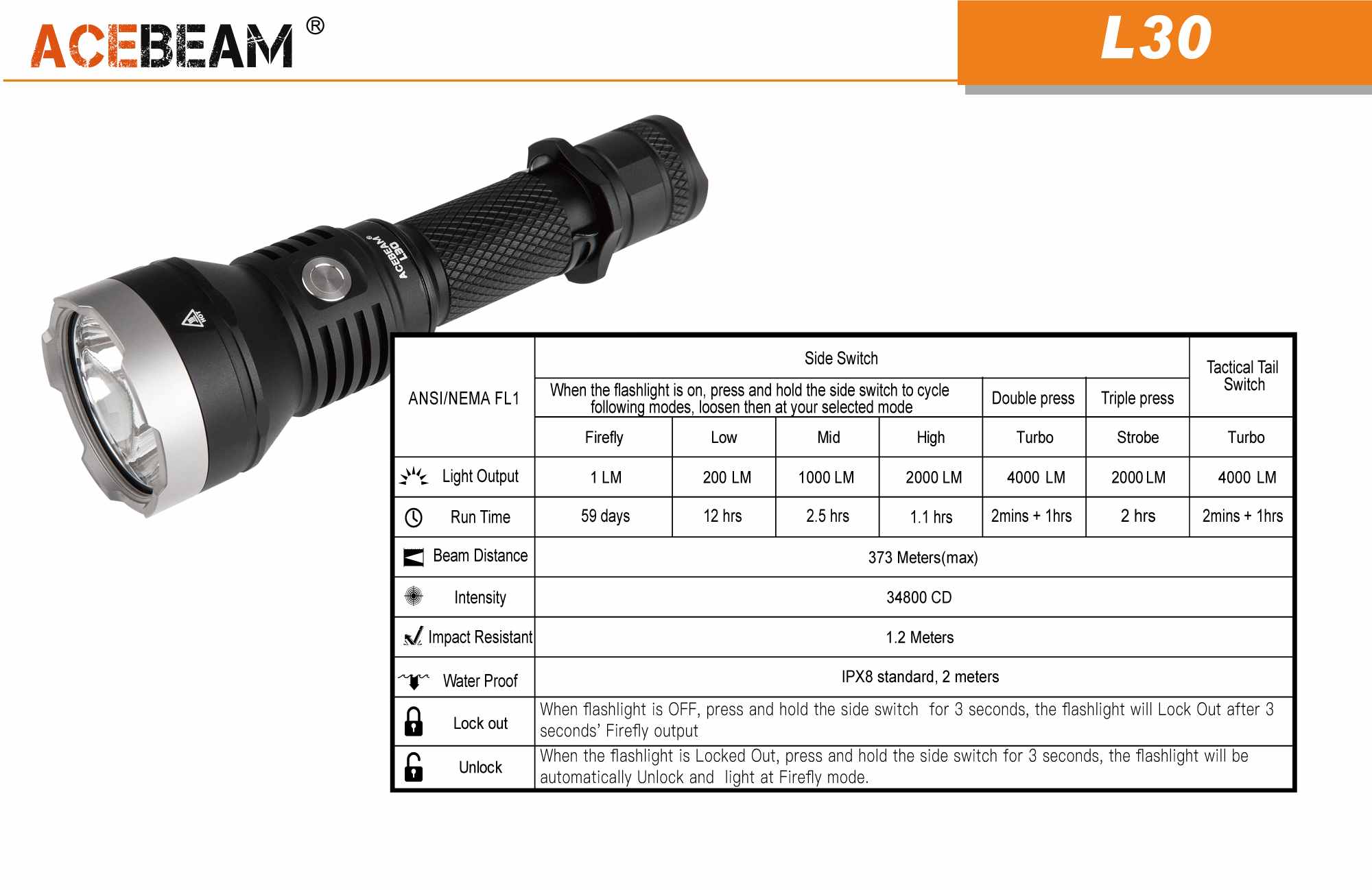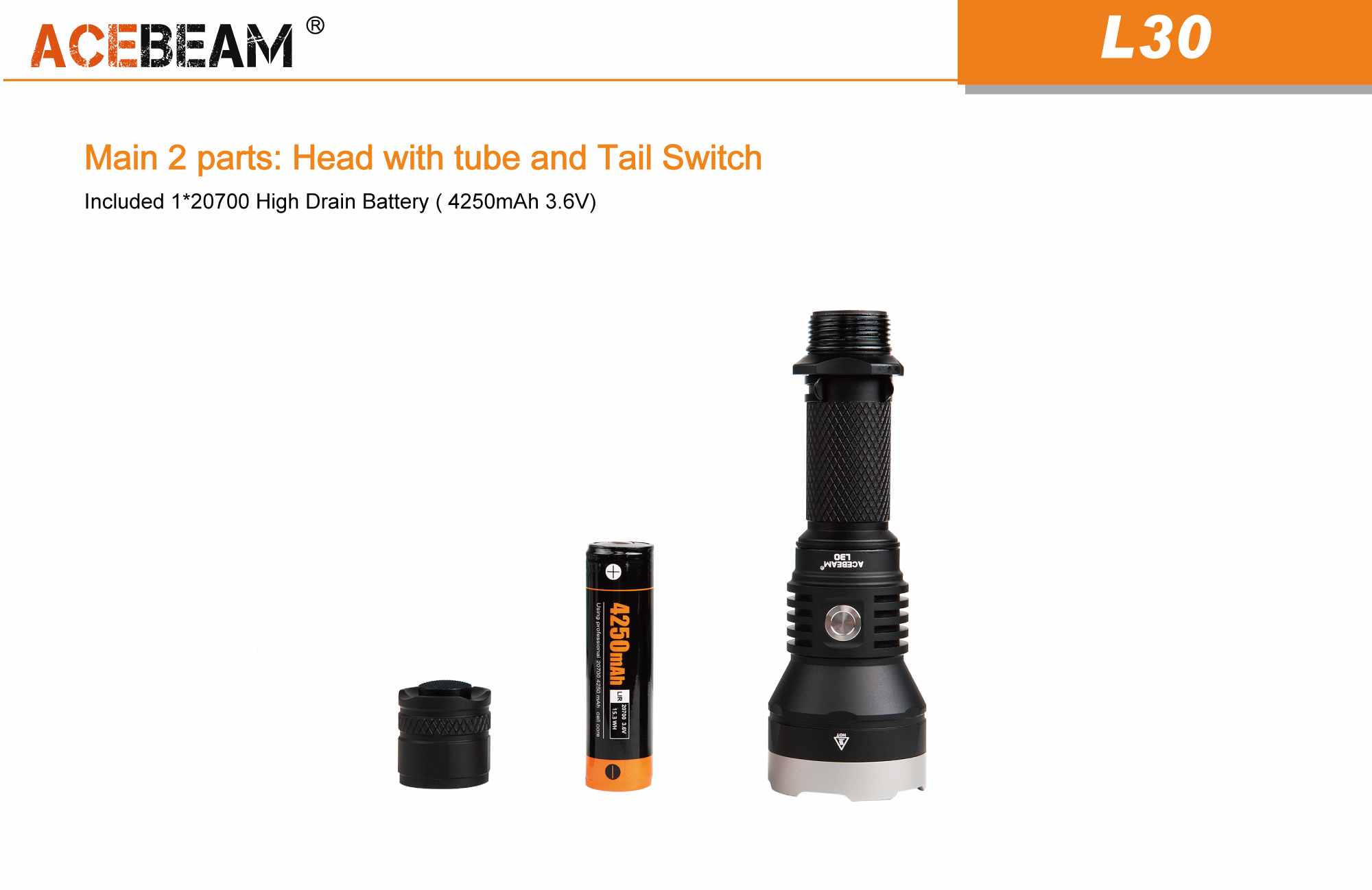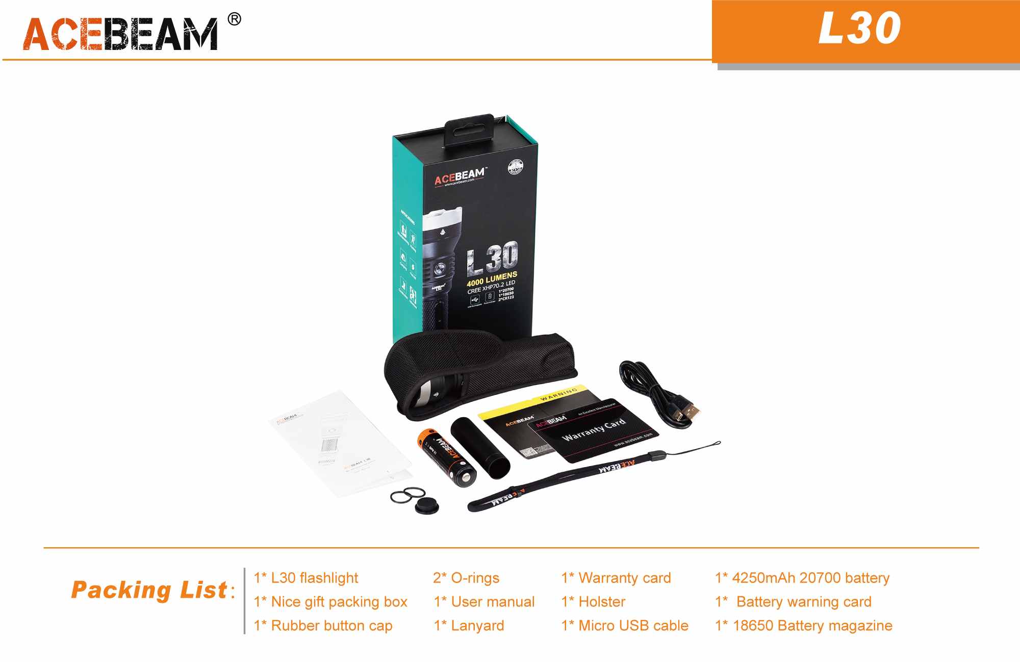 Sie haben nun folgende Möglichkeiten:Die Acebeam L30 ist eine wiederaufladbare LED Taschenlampe für Anwendungen in den Bereichen Polizei, Rettungsdienst, Militär, Jagt und taktische Anwendungen. Die Acebeam L30 verwendet eine CREE XHP70.2 mit einer maximalen Lichtleistung von 4000 Lumen und eine Leuchtweite von 373 Metern. Die Acebeam L30 ist eine Hochleistungs-Taschenlampe die mit zwei unabhängigen Lichtschaltern ausgestattet ist: Ein seitlicher Schalter ermöglicht den Zugang zu den fünf Leuchtstufen und Stroboskop, während der Endschalter den Turbo-Modus und die taktische Momentbeleuchtung auf Tastendruck ermöglicht. Die LED Taschenlampe wird von einem Acebeam IMR20700 Lithium-Ionen-Akku mit 4250 mAh befeuert (im Lieferumfang enthalten), ist aber auch kompatibel mit 1x IMR18650 oder 2 x CR123A Batterien. Das Acebeam L30 wir über ein microUSB-Kabel geladen. Als Netzteil kann man jedes Smartphone Netzteil verwenden. Für Acebeam L30 stehen eine Auswahl an Filter und ein Fernschalter zur Verfügung.