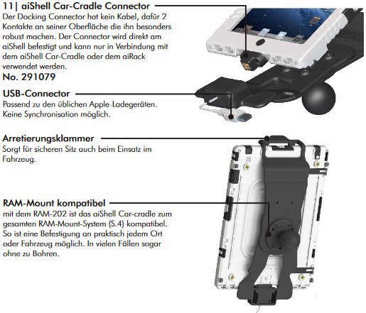 Der Car Cradle ist eine KFZ-Halteschale für Ihr aiShell. Das Car Cradle ist verstellbar und somit passend für das aiShell Air, mini und mini+. Die Arretierungsklammer sorgt für einen sicheren Halt auch bei schwierigen Bedingungen. An den eingebauten USB Connector kann man ein Apple-Ladegerät anschließen. Dadurch ist die Ladung des Apple iPad mini 4, iPad Air 1, iPad Air 2, iPad Pro 9.7 im aiShell mit dem optional erhältlichen Car Cradle Connector möglich. Das Car Cradle ist mit dem RAM-Mount System kompatibel. Das aiShell ist nicht im Lieferumfang!