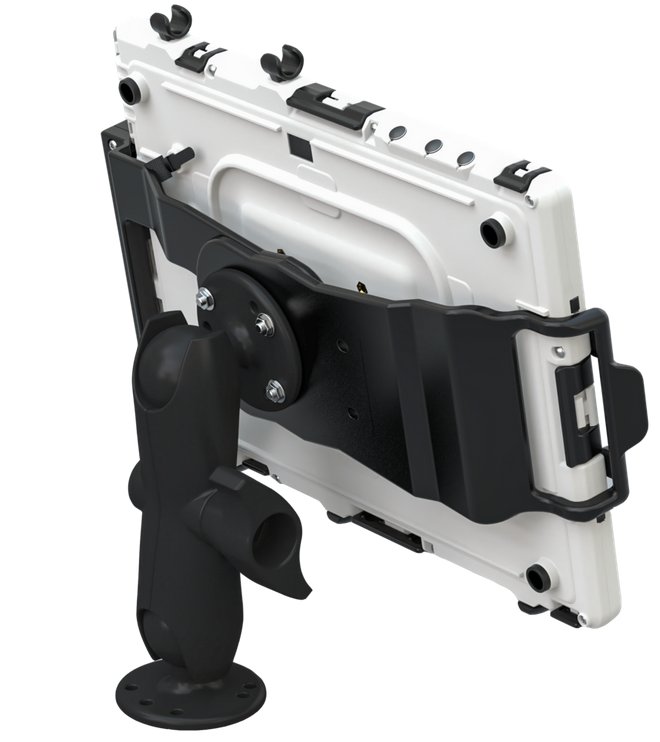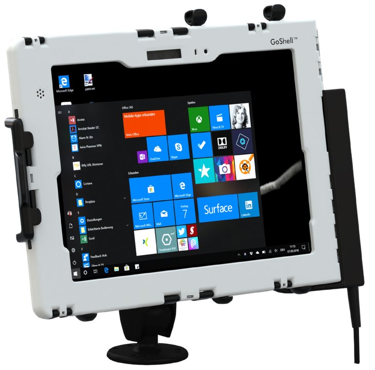 Das Andres Industries GoShell Car Cradle ist besonders nützlich für Fahrer, die ihr Microsoft Surface Go tagsüber häufig ein- und ausstecken müssen. Wenn das GoShell mit dem Car Cradle Connector ausgestattet ist, kann es automatisch im Car Cradle aufgeladen werden. Bei dieser Lösung muss das Gehäuse nicht geöffnet werden und bleibt somit immer wasserdicht. Wie der Quicksnapper kann die Kfz-Halterung entweder direkt an Wänden/Tischen verschraubt werden oder sie kann mit einem RAM-202 oder vielen anderen RAM-Mounts montiert werden. RAM-Mounts sind nicht im Standard-Lieferumfang enthalten.