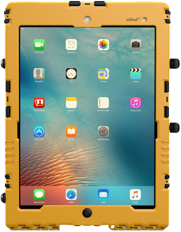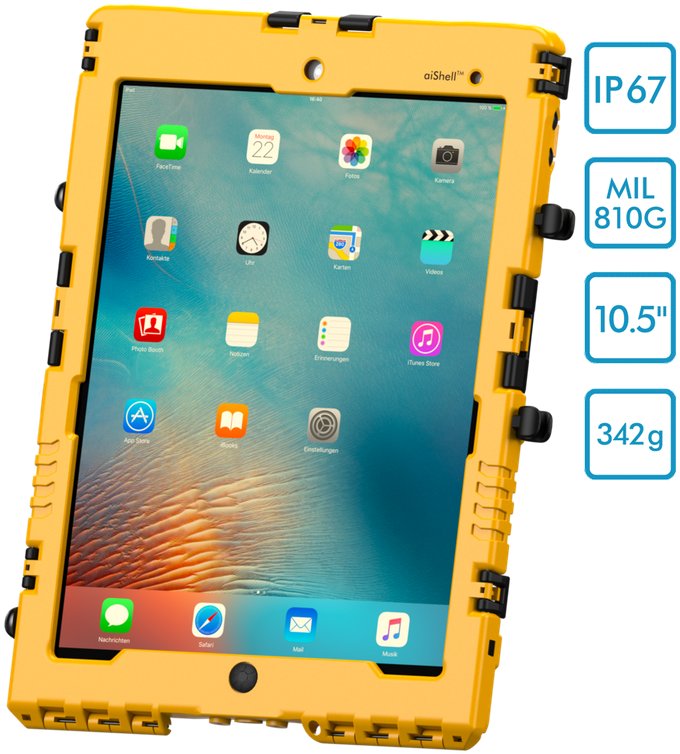 Das aiShell 10 für Ihr Apple iPad Pro 10.5, iPad Air 3, iPad 7/8/9 ist ein Case für den harten Einsatz. Das aiShell 10 ist wasserdicht nach IP67 (voll eintauchbar), schlagfest nach MIL810G (Militärgrad) und mit Spezialschrauben gegen unberechtigtes Öffnen verschließbar. Das aiShell 10 für Ihr Apple iPad Pro 10.5, iPad Air 3, iPad 7/8/9 ist mit Kamerafenster auf Vorder- und Rückseite ausgestattet. Im optionalen Zubehör gibt es viele Befestigungsmöglichkeiten, wasserdichte Ladestecker für die Aufladung auch unter Wasser, aiShell Car Cradle und das aiRack.
