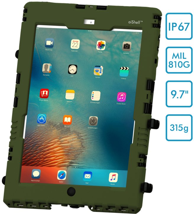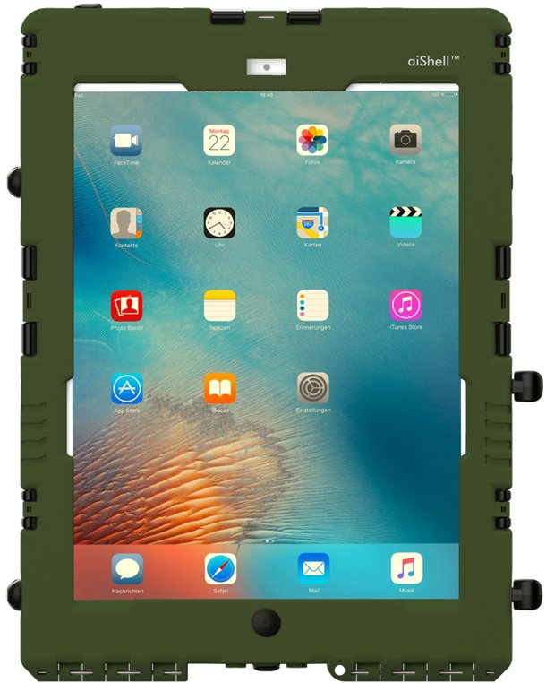 Das aiShell 9.7 für Ihr Apple iPad Air 2, iPad Pro 9.7 (5. Gen. 2017) iPad 5th und iPad 6. Gen. ist ein Case für den harten Einsatz. Das aiShell 9.7 ist wasserdicht nach IP67 (voll eintauchbar), schlagfest nach MIL810G (Militärgrad) und mit Spezialschrauben gegen unberechtigtes Öffnen verschließbar. Das aiShell 9.7 für Ihr Apple iPad Air 2, iPad Pro 9.7 (5. Gen. 2017) iPad 5th und iPad 6. Gen. ist mit Kamerafenster auf Vorder- und Rückseite ausgestattet. Im optionalen Zubehör gibt es viele Befestigungsmöglichkeiten, wasserdichte Ladestecker für die Aufladung auch unter Wasser, aiShell Car Cradle und das aiRack.