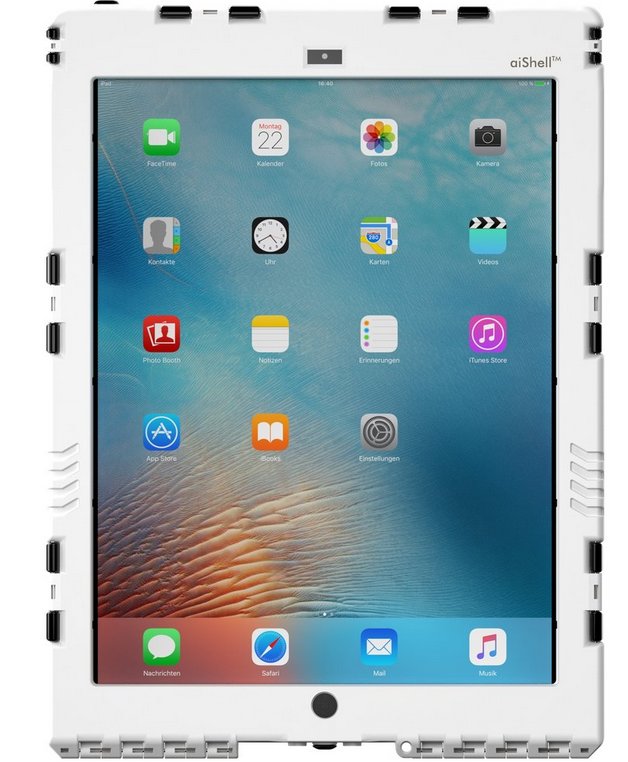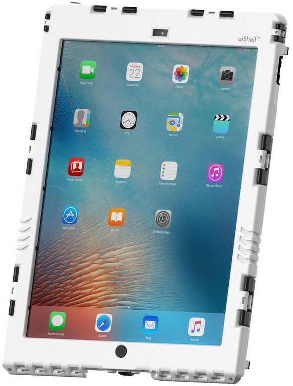 Bei dem aiShell Pro für das Apple iPad Pro 12.9 handelt es sich um ein zuverlässiges Industriegehäuse, welches natürlich auch privat genutzt werden kann. Das Schutzgehäuse ist wasserdicht und schlagfest. Nahezu alle Funktionen wie z.B. Buttons und Kameras lassen sich mit dem Case verwenden. Das aiShell Pro Gehäusesystem erlaubt sogar die optionale Ladefunktion unter Wasser. Durch die ergonomisch geformte Rückseite liegt das aiShell Pro Case viel sicherer in der Hand, als verglecihbare Produkte. Dabei ist das Apple iPad Pro 12.9 trotzdem innerhalb von Sekunden einzulegen und auch wieder zu entnehmen.