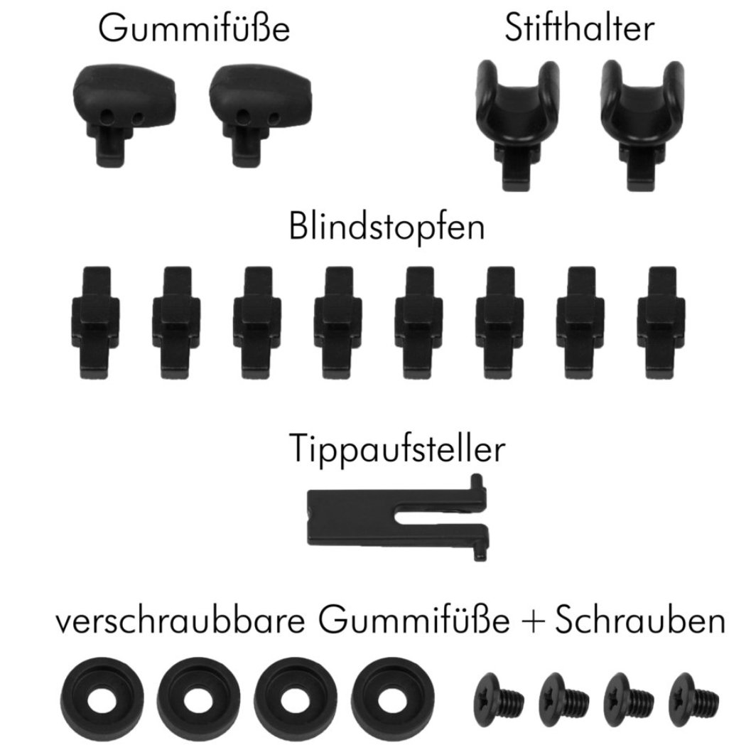 Das aiShell Zubehörset für die seitlichen Aufnahmen des aiShell 8, aiShell 10, aiShell 10.9, aiShell 11, aiShell. Im Zubehörset sind Gummifüße, Stifthalter, Blindstopfen, Tippaufsteller und Karabinerhakenöse.