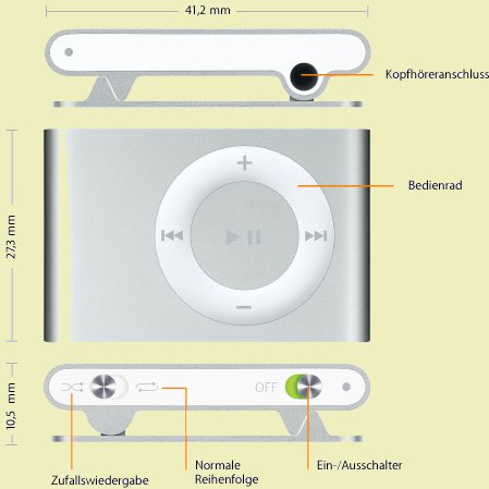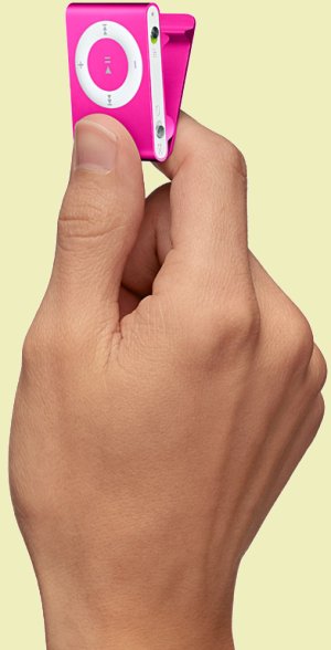Größe ist relativ Natürlich kennen Sie das Sprichwort "Weniger ist mehr". Wie wahr dieses Sprichwort ist, beweist der iPod shuffle, der gerade einmal 4,1 cm lang ist, nur etwa 15 g wiegt und Platz für bis zu 240 Songs bietet. Hinzu kommt, dass Sie Ihre Musik damit bis zu 12 Stunden lang ohne Unterbrechung hören können. Man kann also mit Fug und Recht behaupten, dass der winzige iPod shuffle bei halber Größe viel mehr zu bieten hat, als man ihm auf den ersten Blick zutraut. Immer im Trend Klemmen Sie ihn an die Jeans. Oder an Ihre Handtasche. Egal, wo Sie ihn anklippen, mit Ihrem iPod shuffle haben Sie Ihre Musik jederzeit griffbereit. Das Gehäuse in den Farben Silber, Pink, Grün, Blau und Orange passt hervorragend zu jedem Outfit. Einfach festklemmen und einschalten - Sie werden ohne Zweifel viele begehrliche Blicke auf sich ziehen. Neu abgemischt Damit Sie Ihren iPod shuffle mit bis zu 240 Songs füllen können, müssen Sie zuerst iTunes laden - gratis. Dann setzen Sie den iPod shuffle in das mitgelieferte Dock ein und schließen dieses an den USB-Anschluss Ihres Mac oder PC an. Schon wird der iPod shuffle innerhalb weniger Minuten synchronisiert. In Ihrer iTunes Bibliothek befinden sich mehr als 240 Titel? Kein Problem. Überlassen Sie es iTunes, Ihren iPod shuffle automatisch zu füllen und genießen Sie Ihre Musik jedes Mal neu. |