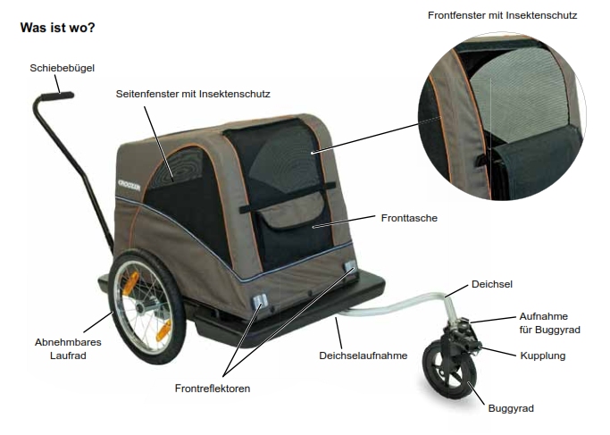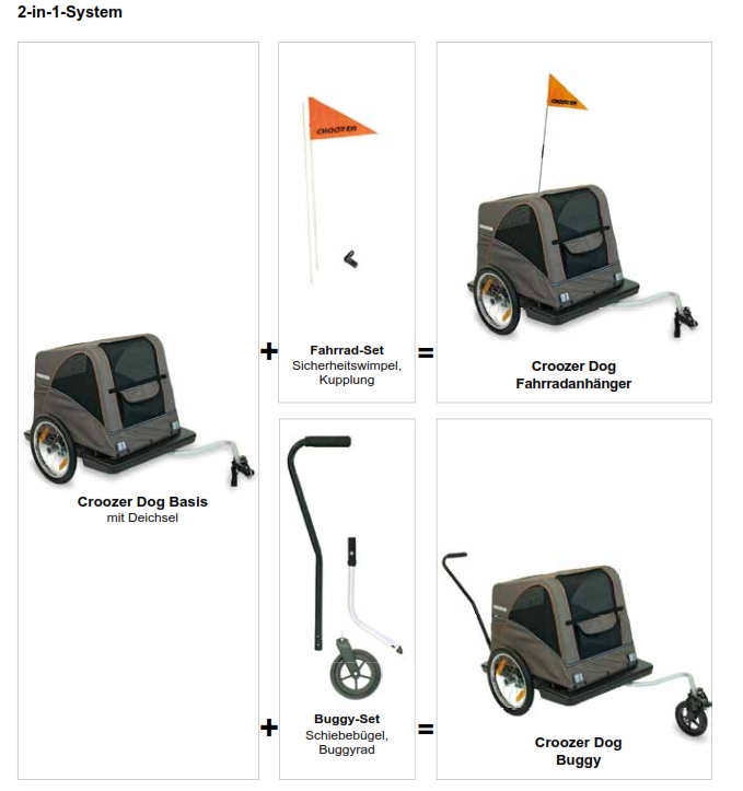 Sie haben nun folgende Möglichkeiten:Der Croozer Dog ist auf Straßen und befestigten Wegen zum Transport von Hunden und Kleintieren, als Fahrradanhänger oder als Buggy bestimmt. Die zu transportierenden Hunde müssen angeschnallt sein, um die Fahrsicherheit nicht zu beeinträchtigen.